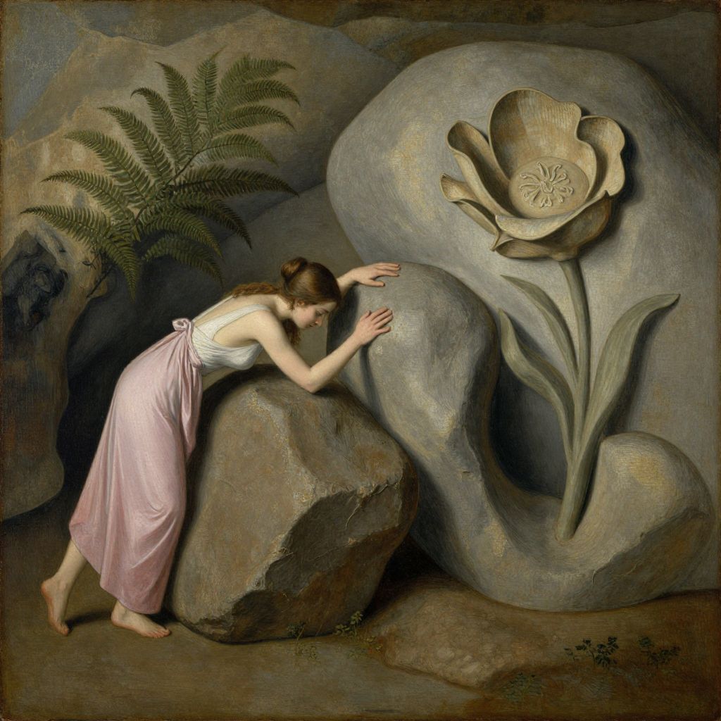 Woman transforming into a rock and a flower sculpted by henri moore. textured cavern walls. fern. painting by piero della francesca, morandi, alex colville