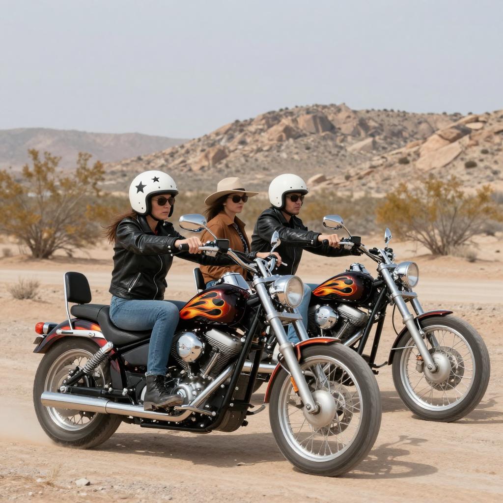 Three people riding custom choppers through a desert landscape. Front rider extends left arm, wearing black leather and white helmet with star pattern. Middle rider wears black leather and white helmet, gripping handlebars. Rear rider in brown jacket and beige hat, gripping rear seat. All bikes have long front forks, chrome details, and flame-patterned fuel tanks. Background includes dry shrubs, rocky hills, and a dirt road. Bright daylight, clear sky.