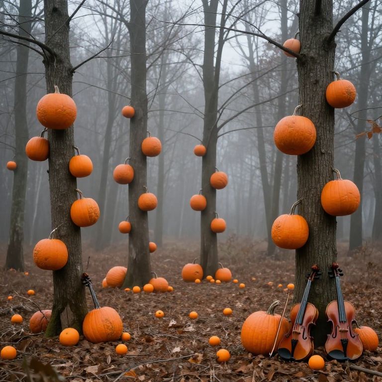 Orchestrated pumpkins hang from bare tree trunks in a misty forest, surrounded by scattered orange fruits and violins resting on the ground, creating a surreal blend of nature and music.