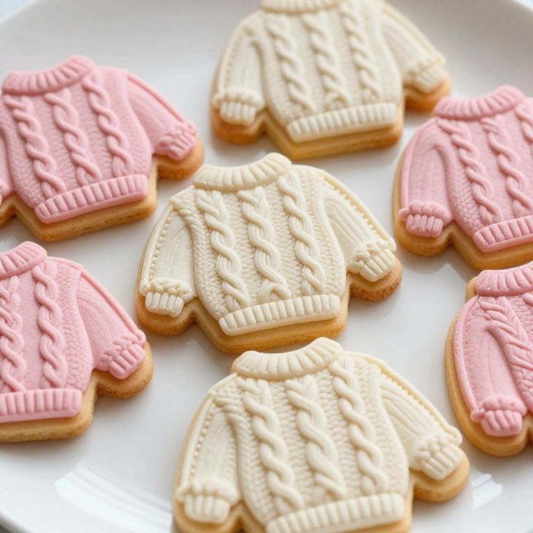Delicate cable-knit sweater cookies, crafted in soft pastel shades of pink and cream, are artfully arranged on a white plate, showcasing intricate textures and detailed craftsmanship.
