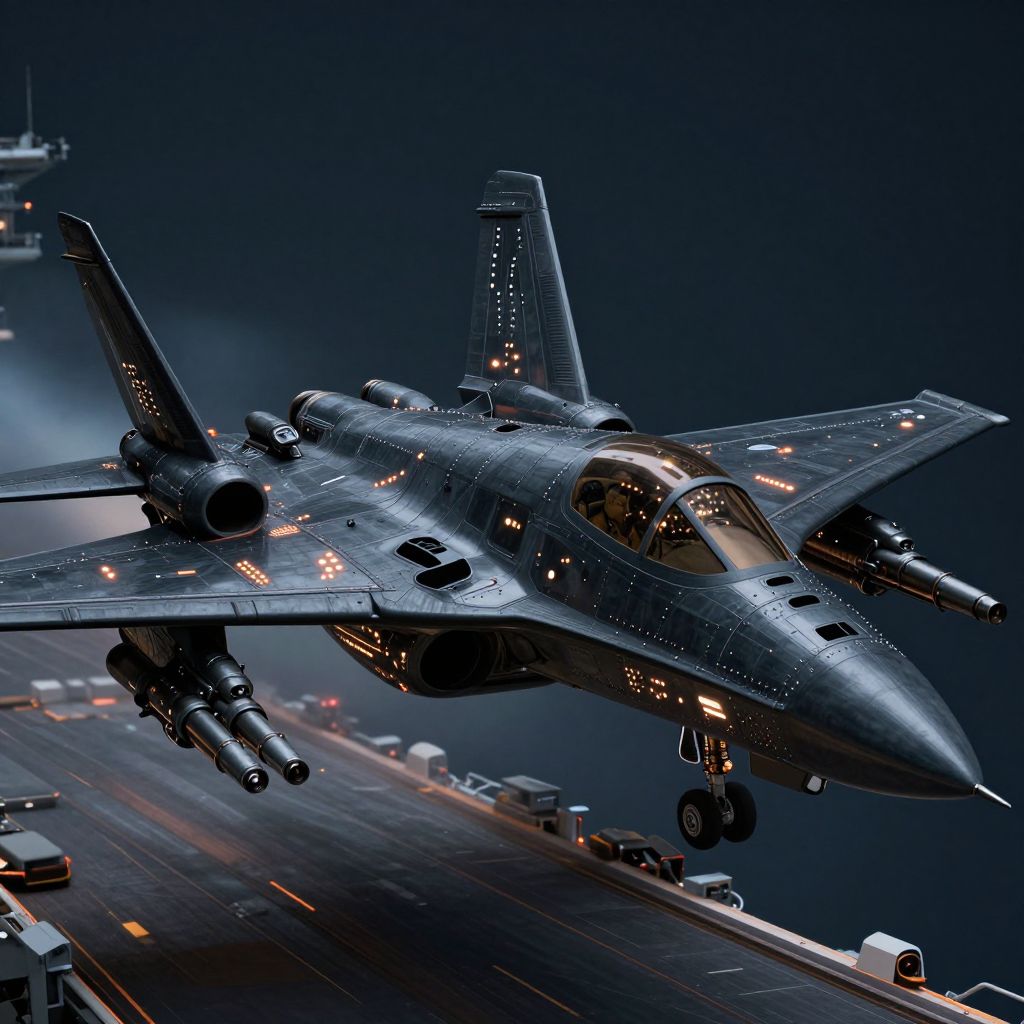 Silhouette art, askynetcyberdynesystemscraft, the image is featuring a futuristic, highly advanced fighter plane taking off from an aircraft carrier at night, The plane is made of a dark gunmetal alloy with rivets, bolts, glowing LEDs and diodes, and has large guns mounted on the exterior; the cockpit shows glowing led lights, and has a large air intake, two-man crew visible through the cockpit window
