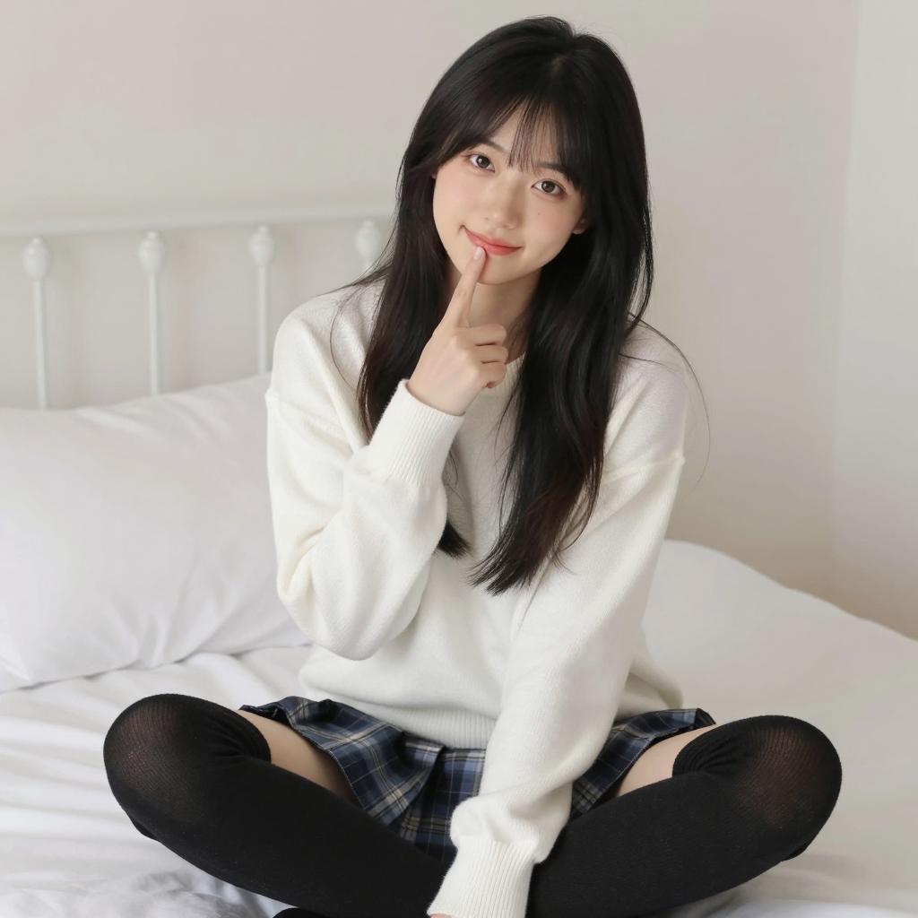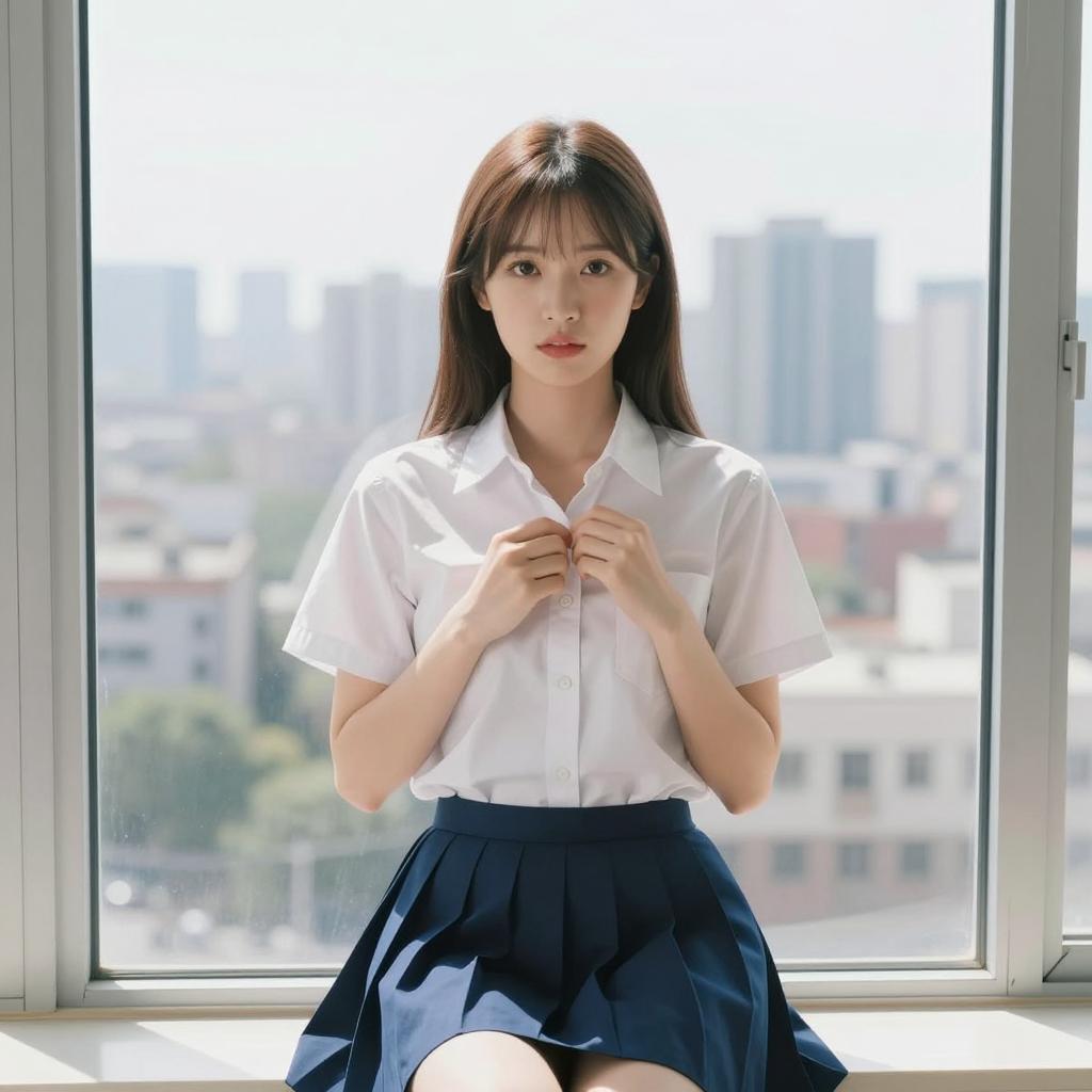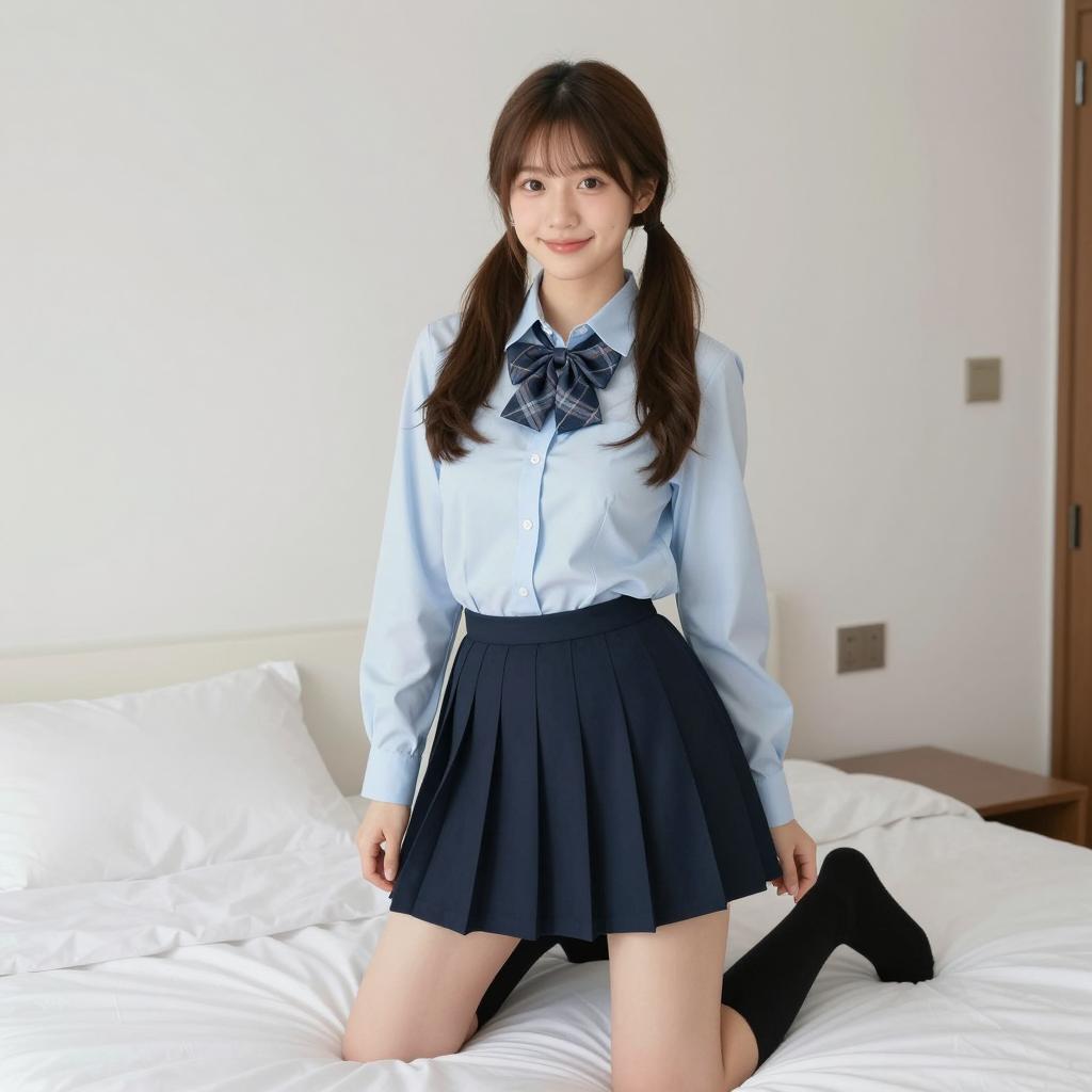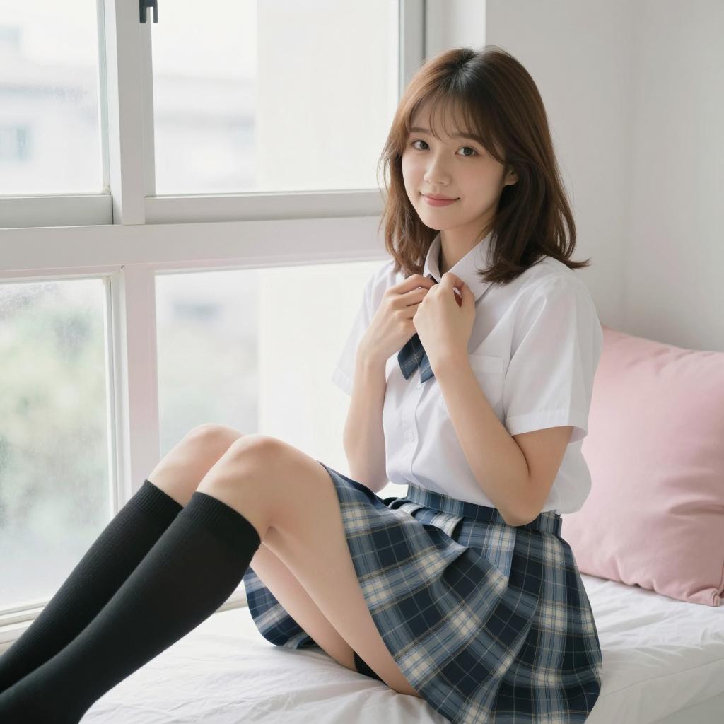 Young Japanese woman with long dark brown hair and bangs, sitting on a bed. Wearing a white short-sleeved shirt, brown plaid skirt, and black knee-high socks. She has fair skin and a neutral expression. Background shows a window with light filtering through curtains, wooden wall paneling, and a bed with a striped blanket. Daylight illuminates the room. CRS-JAPAN is visible near the window.