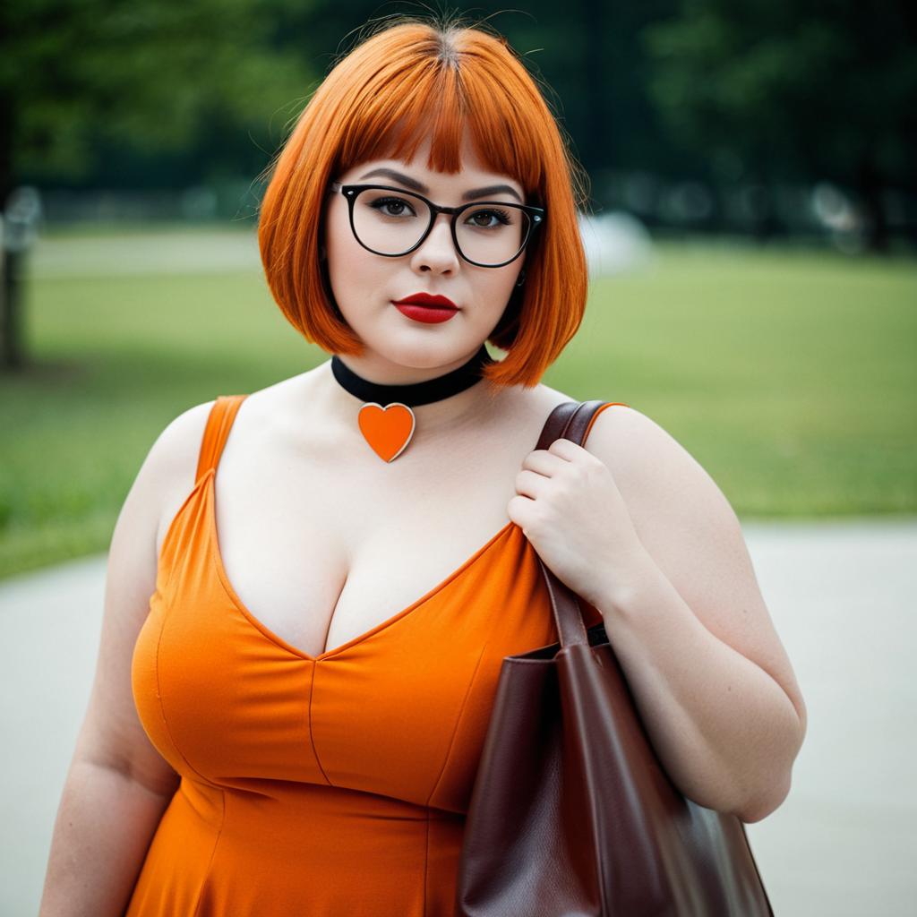 Plus size velma cosplay,1girl, solo, dress, glasses, breasts, orange dress, short hair, blurry background, blurry, sleeveless, bag, red lips, sleeveless dress, choker, round eyewear, outdoors, orange hair, brown hair, lips
