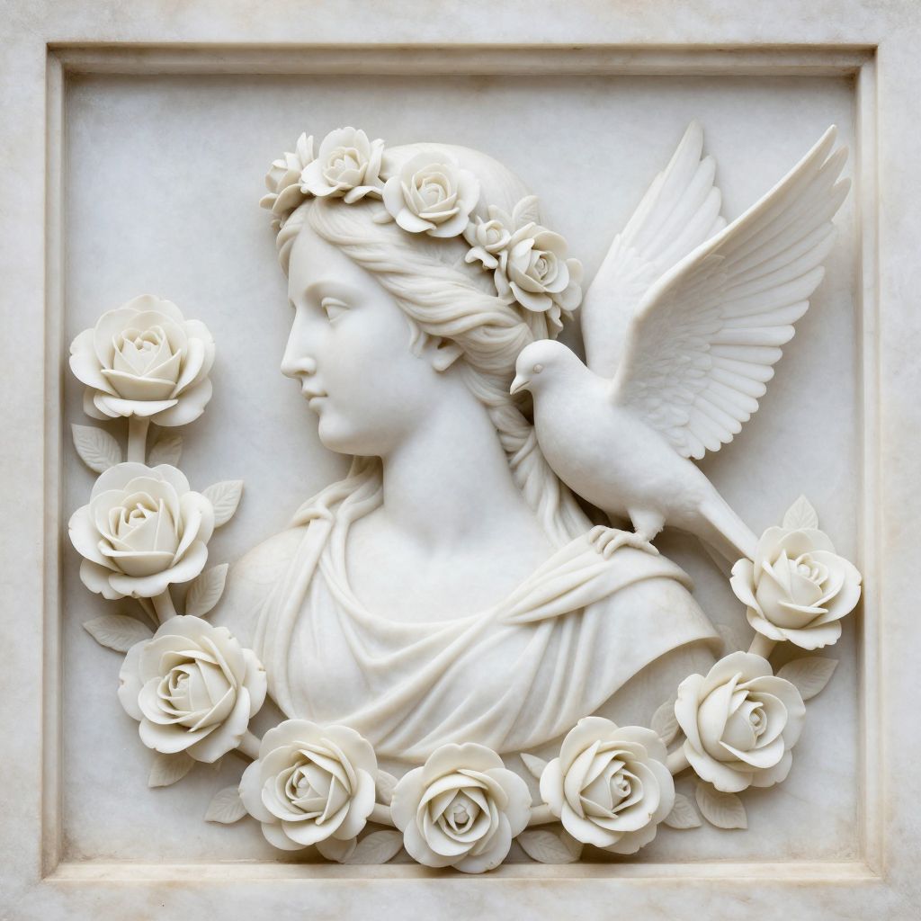 Elegant marble relief depicts a serene profile of a woman adorned with a floral crown, surrounded by seven delicate white roses, while a dove gently perches beside her, its wings spread in graceful flight.
