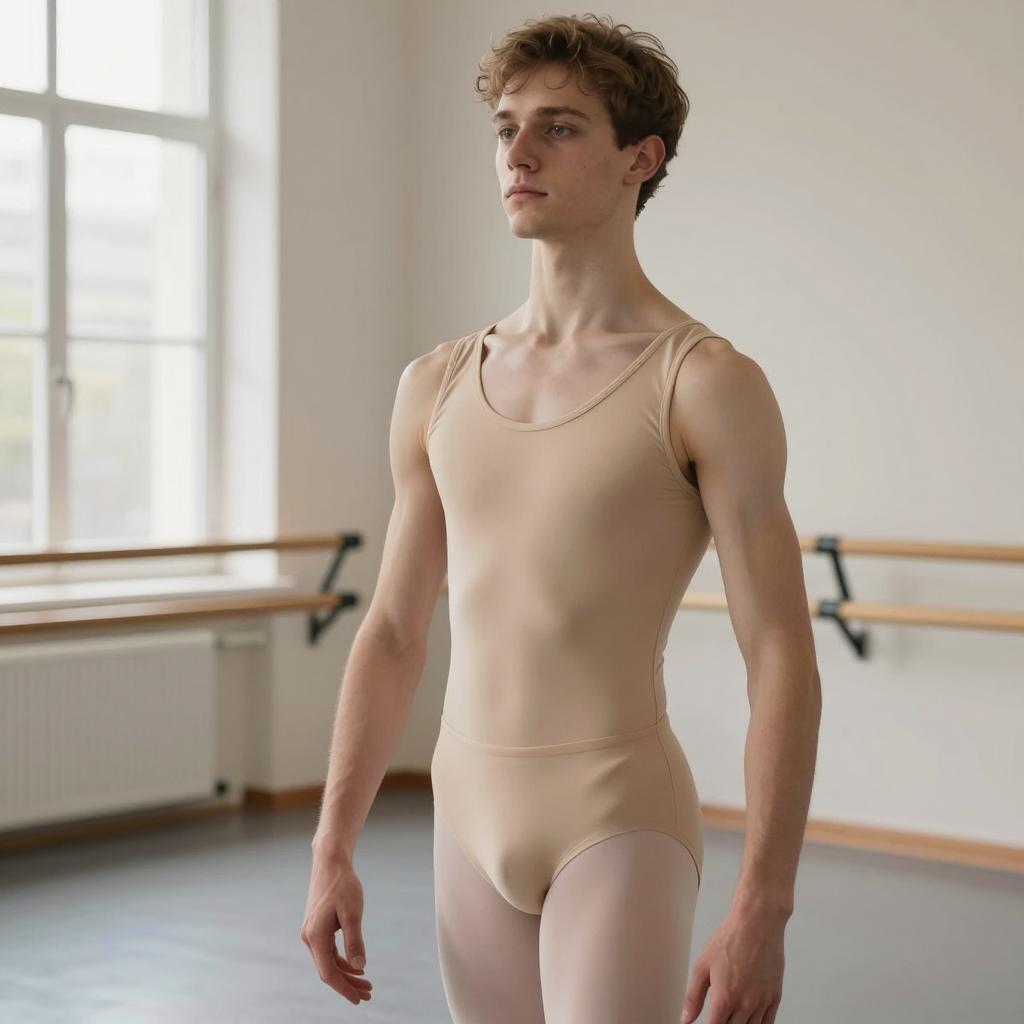 Ballet training outfit, photorealistic, young white male, fit and muscular, brown short hair, wearing tight beige leotard, visible bulge in pants, standing in ballet studio, natural light from window, ballet barre in background, serious expression, studio walls beige, floor light grey, realistic ures, T2I, realistic lighting, detailed muscles, casual pose, male ballet dancer, soft colors