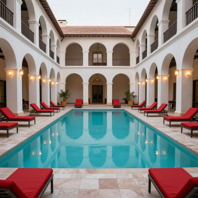 Urban architecture frames a serene turquoise pool flanked by symmetrical rows of arches, illuminated by warm wall sconces and dotted with vibrant red lounge chairs, creating a tranquil oasis within a historic courtyard.