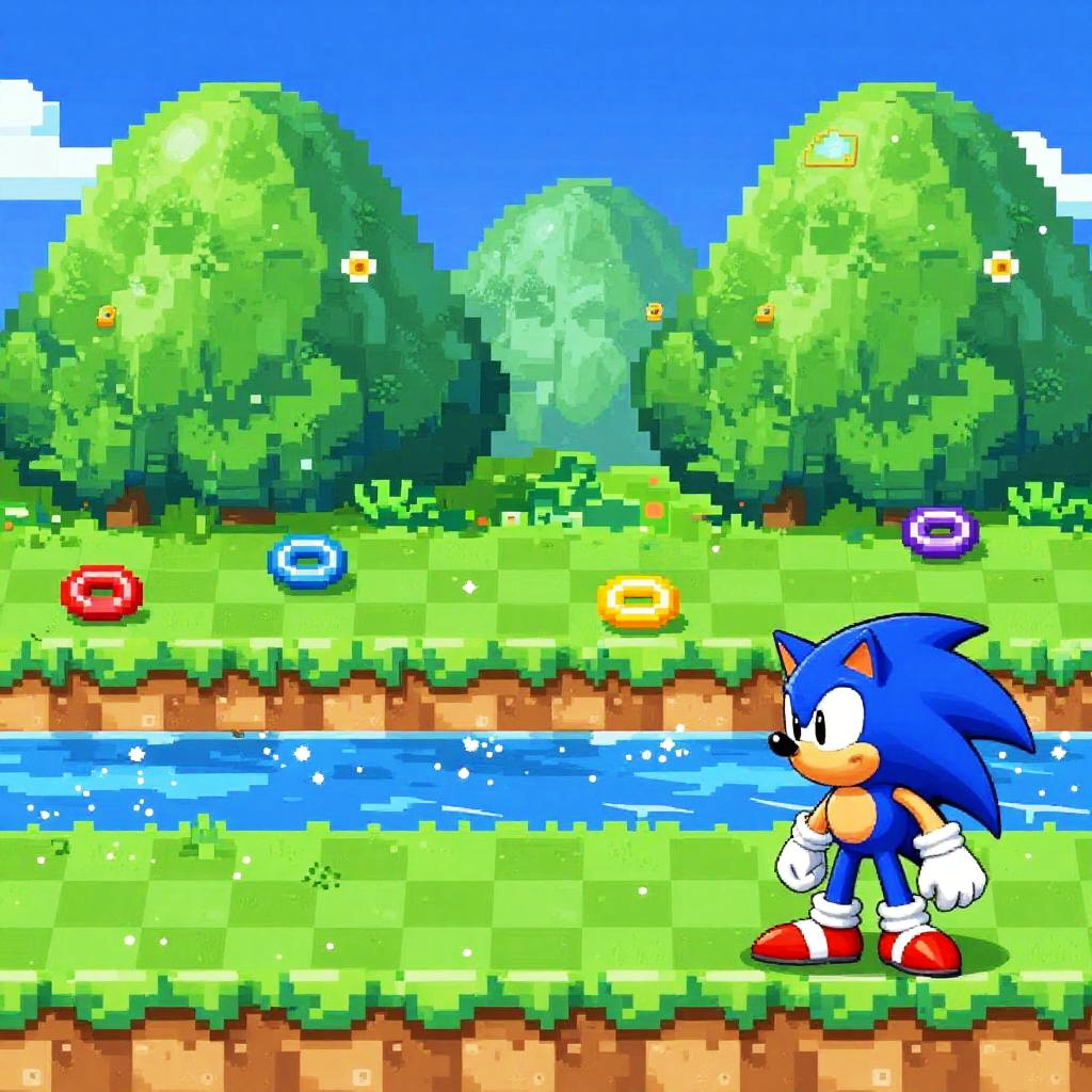 Sonic game backgrounds featuring vibrant, lush green hills under a bright blue sky, detailed pixel art style with looped checkerboard patterns, sparkling waterways, and whimsical, colorful rings scattered throughout the landscape, evoking classic 90s platformer vibes.