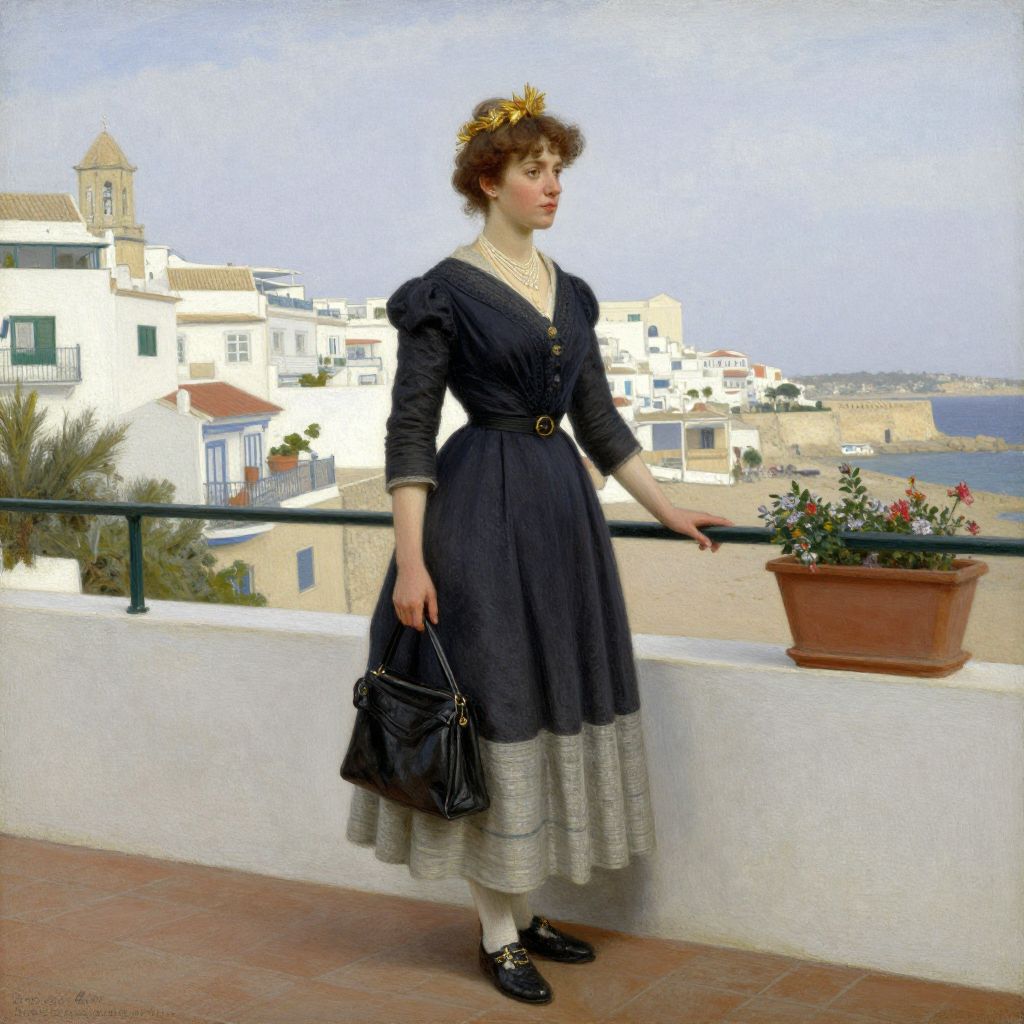 This is a digital painting of a young white woman with curly brown hair adorned with a yellow floral headband. She wears a dark navy blue, Victorian-style dress with puffed sleeves, a high white collar, and gray lace trim at the hem. She holds a black leather handbag in her right hand and stands with her left hand on a white balcony railing. She wears black shoes with silver buckles. Behind her, a picturesque coastal town with white-washed buildings and a church steeple stretches to the sea under a clear blue sky. A terracotta planter with red and green flowers sits on the railing to her right.