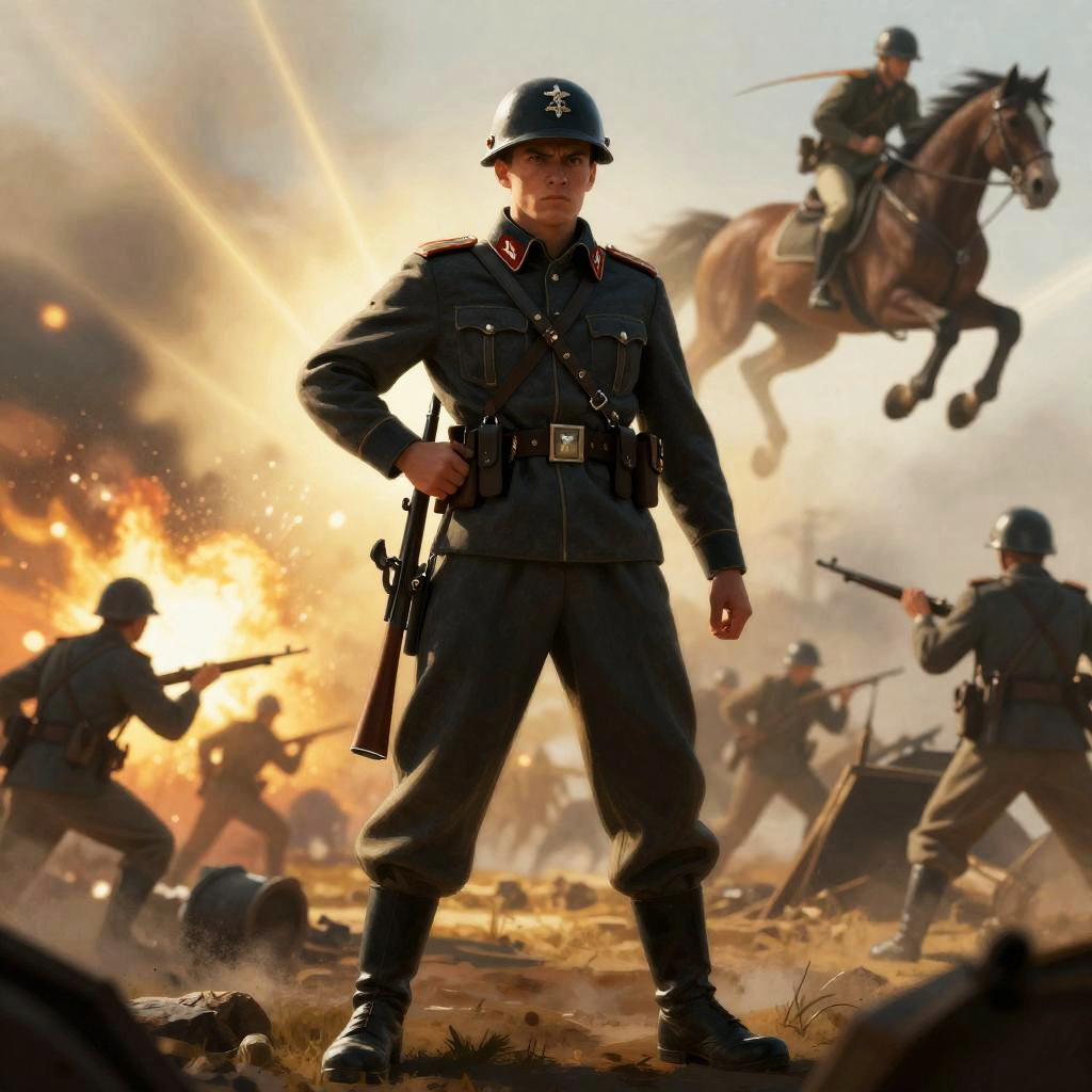 Illustration of a World War II battlefield. Central figure: Nazi soldier with hands on hips, rifle in left hand, stern expression. Upper right: horse with rider in mid-leap. Lower half: chaotic battle scene with soldiers, explosions, and golden light.