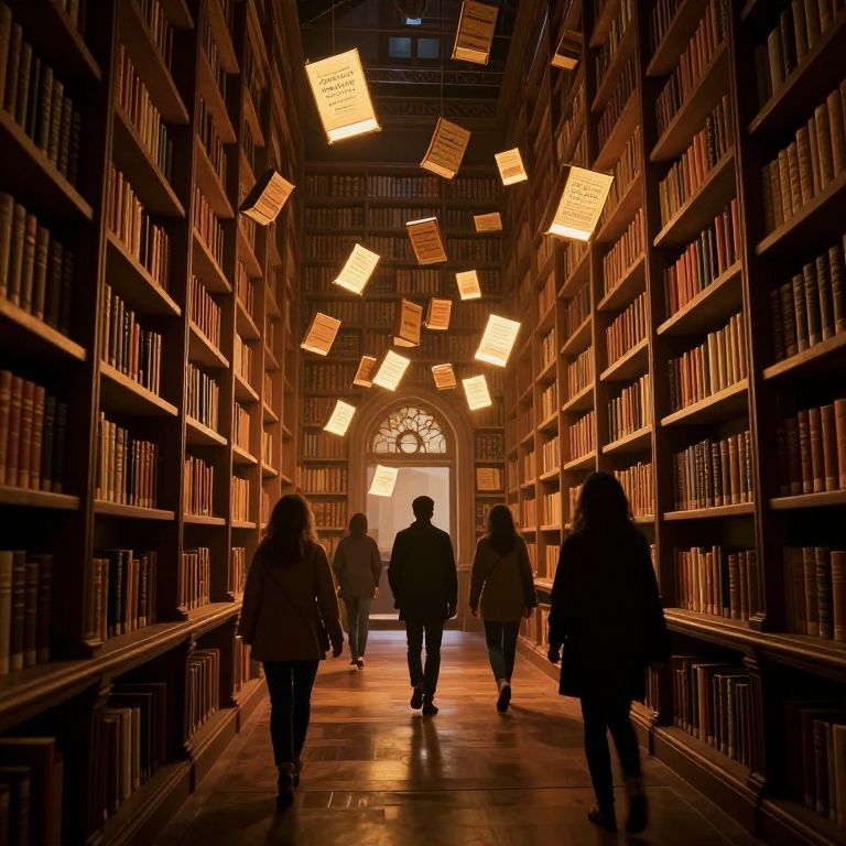 In a grand, atmospheric library rendered in a cinematic 3D style with dramatic lighting and a vintage aesthetic, visitors wander through rows of illuminated bookshelves, their figures silhouetted against the warm glow of floating, glowing tomes that seem to whisper secrets in various languages, creating an enchanting and immersive scene.