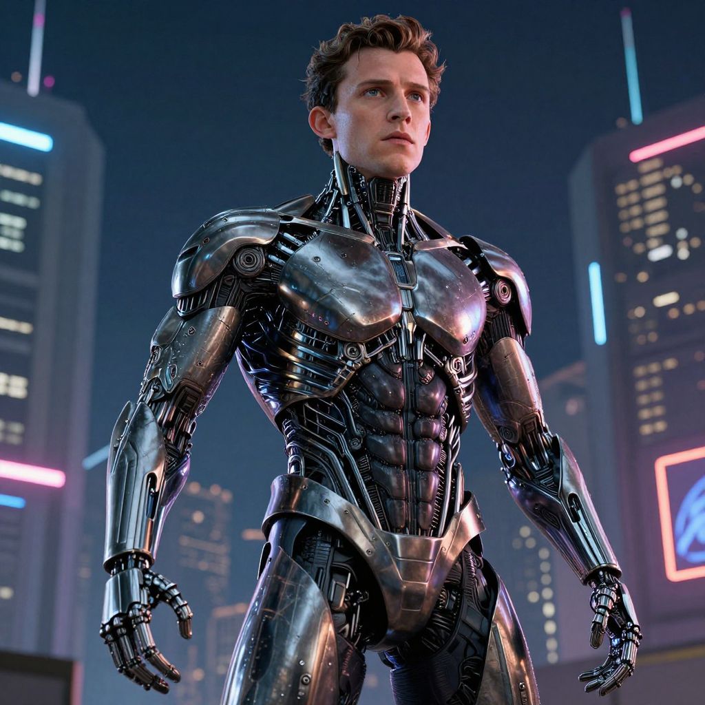 Tom Holland body depicted as a futuristic cyborg superhero, metallic muscular enhancements combining with organic human form, neon-lit sci-fi cityscape background at night, high contrast lighting, intricate mechanical textures, dynamic composition