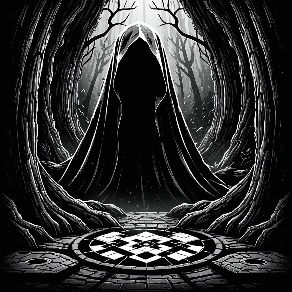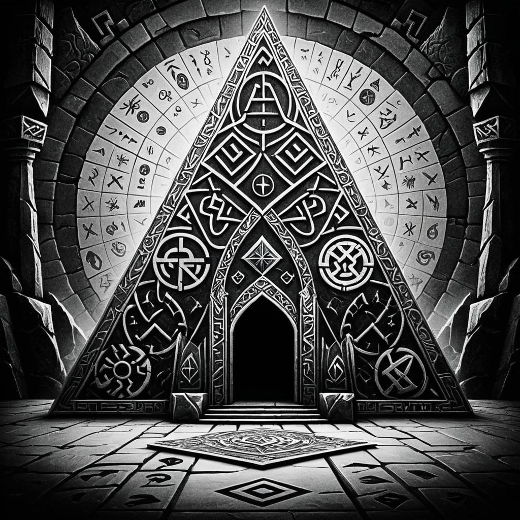 Black and white high-contrast image of a triangular pyramid structure adorned with intricate rune carvings and symbolic ancient glyphs. The pyramid stands in a stone chamber with decorated stone walls and an open dark doorway. The floor features rune-like symbols and geometric stone patterns, creating a mysterious and mystical atmosphere.