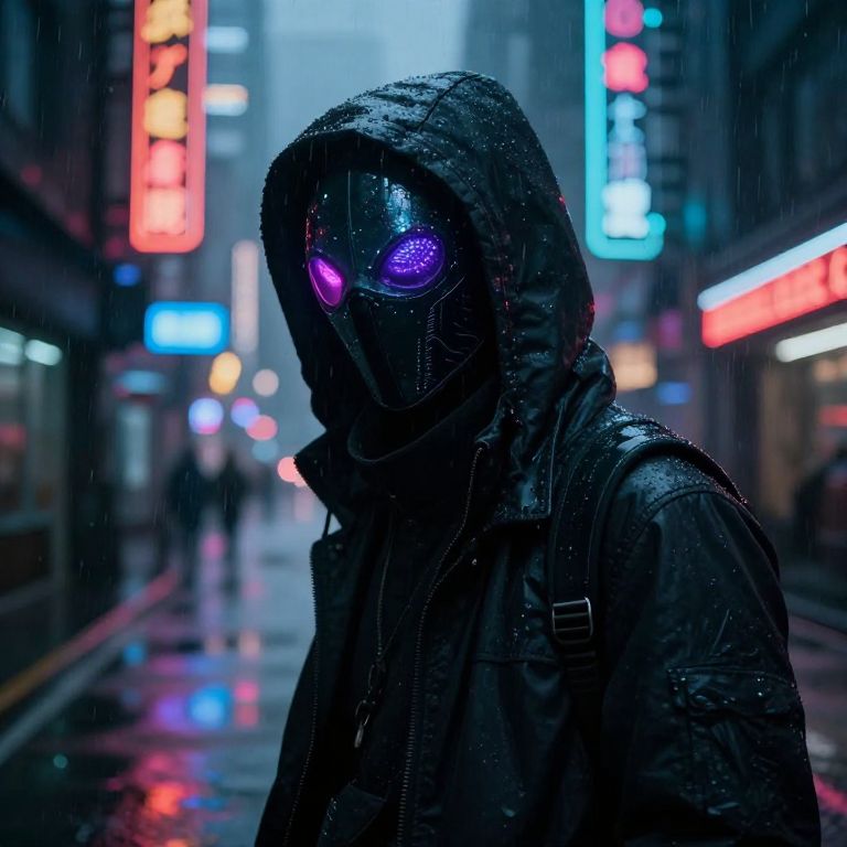 Smiler character depicted in a dystopian cyberpunk city, neon-lit streets reflecting on wet pavement, unsettling smile shining through a futuristic mask, intense color contrast, detailed urban environment with glitch effects and rain.