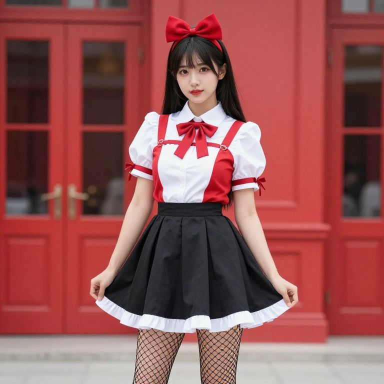 Female, dressed in a red and white outfit with a black skirt and fishnet stockings. She has a red bow on her head and is standing in front of a red building.