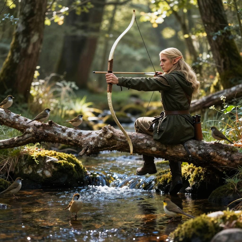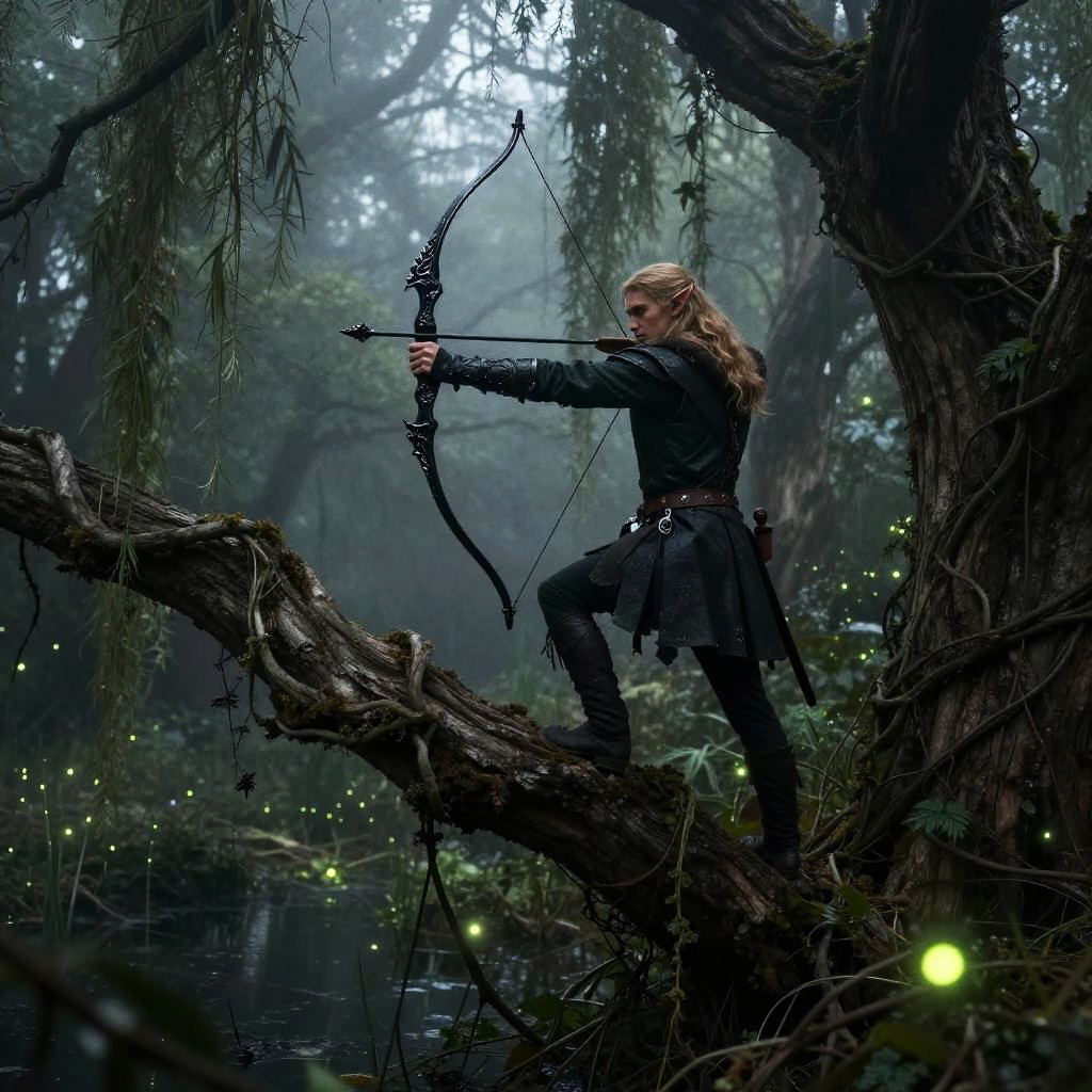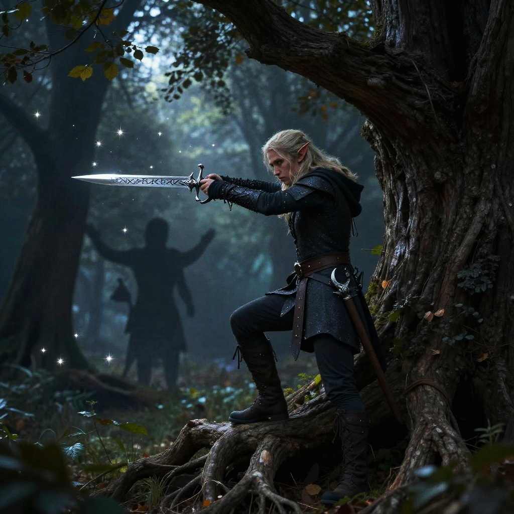 An elven ranger perched on the gnarled roots of a colossal tree, aiming a sleek silver dagger etched with runes, in a twilight forest filled with shadowy silhouettes, surrounded by twinkling stars and whispering leaves, mysterious and stealthy, cinematic and detailed