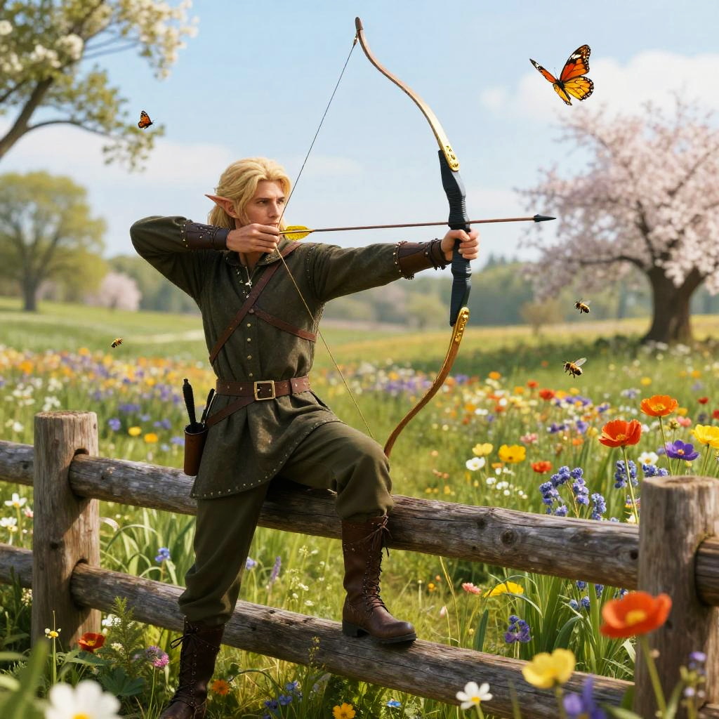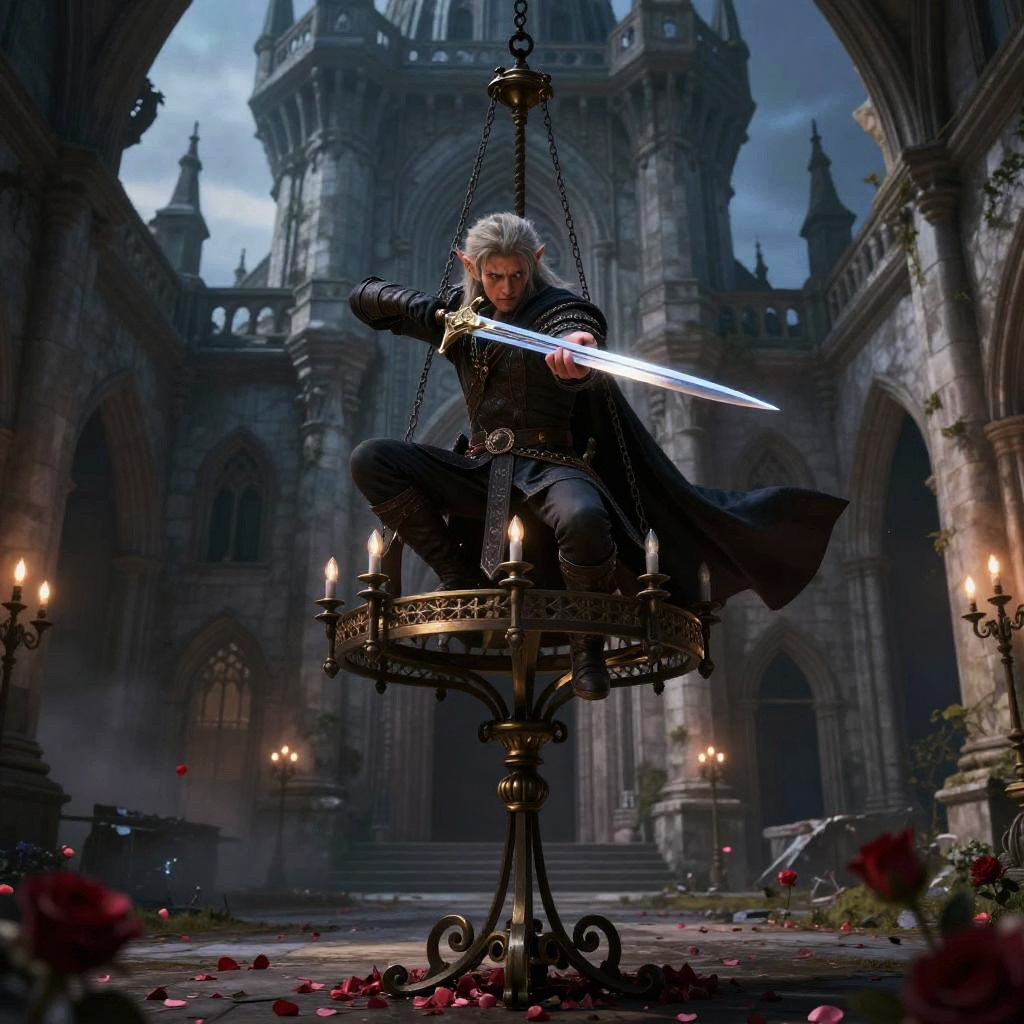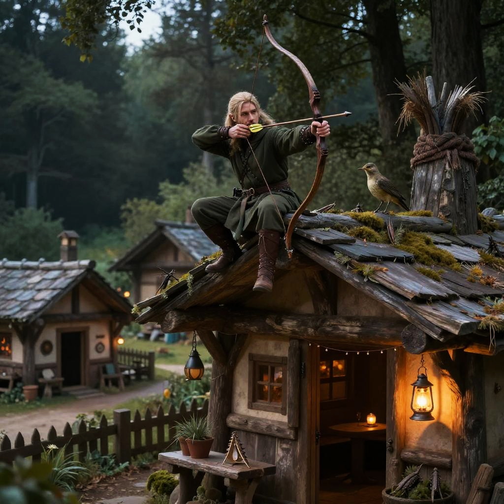 An elven ranger perched on the gnarled roots of a colossal tree, aiming a sleek silver dagger etched with runes, in a twilight forest filled with shadowy silhouettes, surrounded by twinkling stars and whispering leaves, mysterious and stealthy, cinematic and detailed