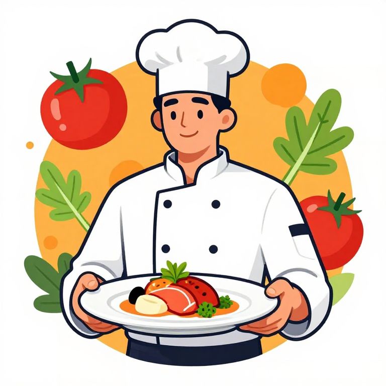 A cheerful male chef presenting a beautifully plated dish, showcasing his culinary skills. The vibrant background features stylized tomatoes and herbs, emphasizing the fresh, inviting theme of cooking. This illustration is characterized by bold colors and a playful, modern design style.