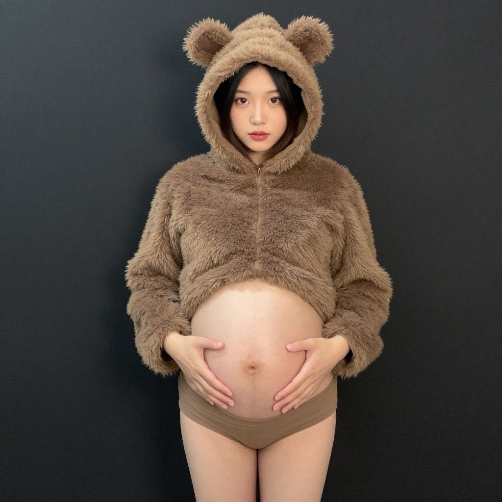 "baby costume pregnancy, solo, 1girl, hood, pregnant, animal costume, full body, bear costume, standing, animal hood, hands on own stomach Realistic photo of casual sexy person with pretty face"