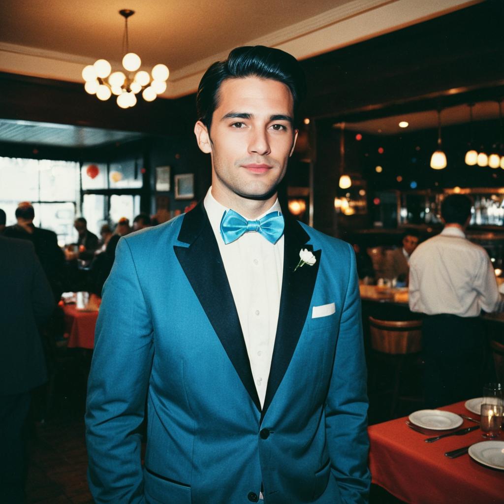 Retro Party Outfit Male, man in a suit and blue bow tie standing in a restaurant