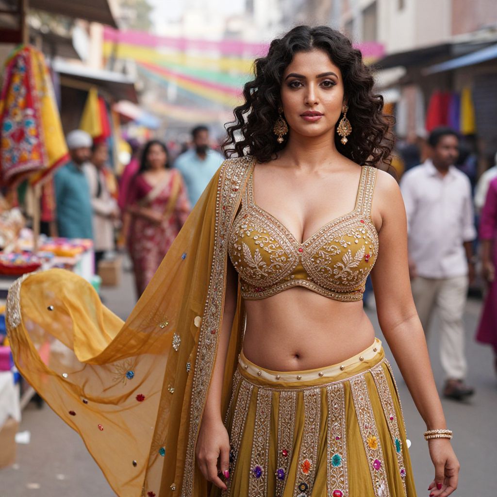 A fashionable woman with olive skin, curly black hair, and a confident expression donning an elegant designer ghagra choli costume at a vibrant festival in a bustling Indian market, colorful fabrics fluttering in the wind, detailed textures visible, natural daylight. The woman has big tits and cute face