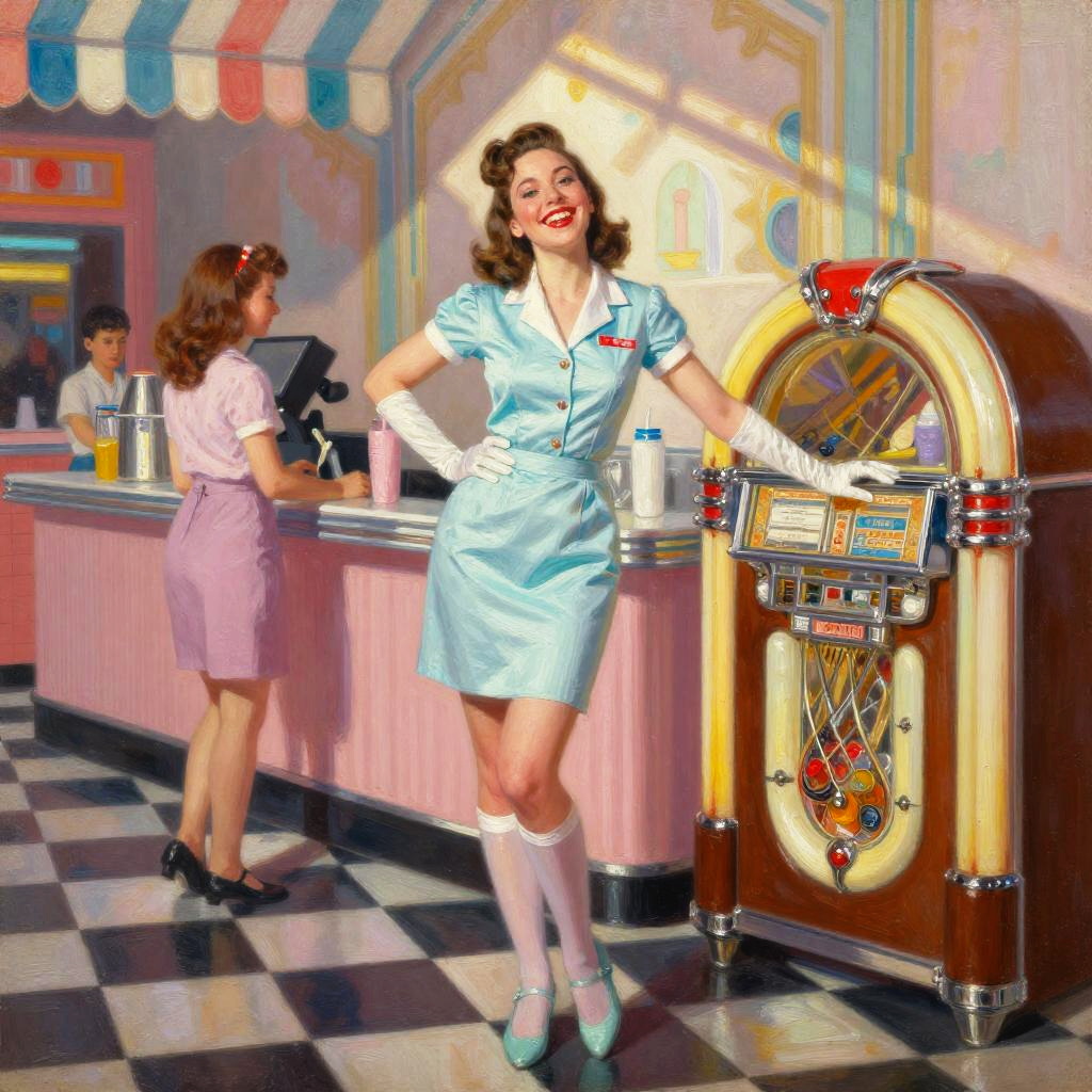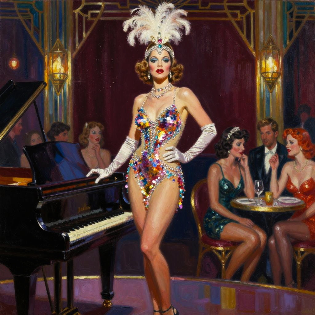 Props beautiful jeremy mann + matthaus merian the elder + olivia de berardinis + vargas, expressive oil painting and pin-up illustration vibe, full body portrait of a carefree 1930s beachside singer in polka-dot swimsuit and finger wave curls, in a lively boardwalk cafe with painted murals and striped umbrellas, bright daylight with crisp shadows and warm glowing highlights, art deco geometry, saturated but elegant palette, lush brush strokes, glossy lipstick, finger waves, long gloves, cinematic depth of field, moody atmosphere, ultra-detailed, colorful