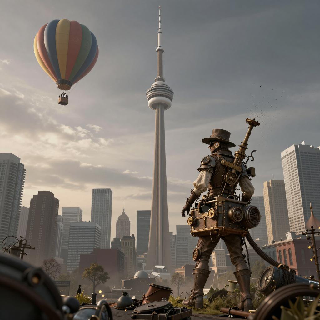 Splattering A steampunk Victorian version of Toronto, Canada. A view of the CN Tower and skyscrapers. A hot air balloon flying above the city. Sunrise. Gloomy style, cinematic, ultra-realism, hard light, insane details.,