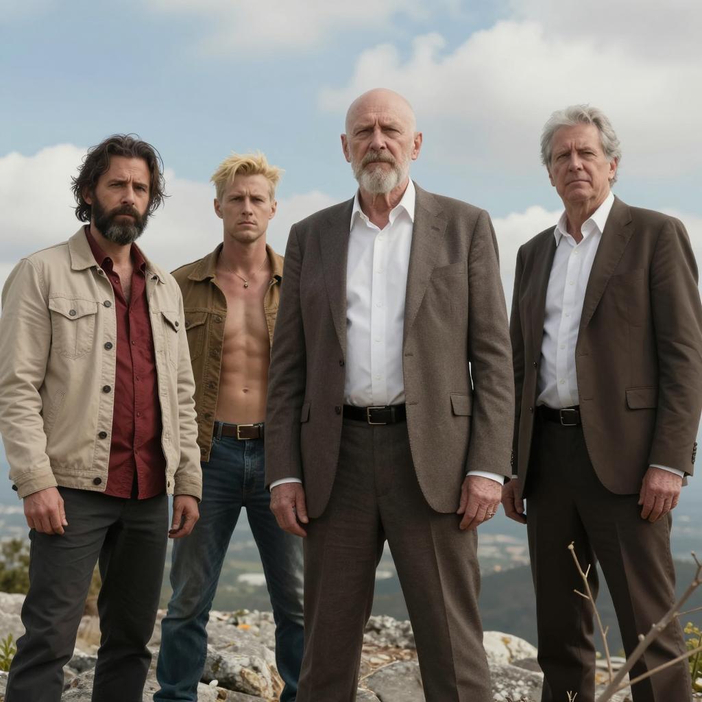 Photograph of five people in a dimly lit room. A shirtless, muscular man with long blonde hair and a beard stands on the right. Four others, two men and two children, stand close together. The man in a yellow jacket on the left smiles, the others have neutral expressions. Background includes a dark, foggy atmosphere with a faint light source. The children wear dark and red clothing, and the man in the center has dark, curly hair.