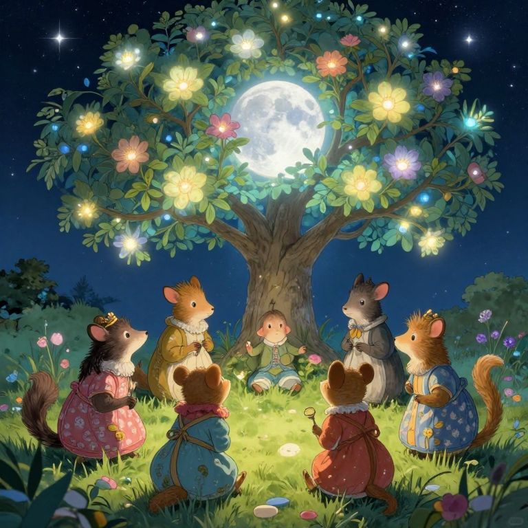 Imagine an enchanting digital illustration in a whimsical style reminiscent of Beatrix Potter's beloved creations, depicting anthropomorphic animals gathered around a glowing moonlit tree adorned with intricate, luminescent blooms. From above, observe these creatures engaging in a lively discussion beneath the starry sky, their expressions filled with curiosity and wonder. The scene is bathed in a soft, ethereal light that casts gentle shadows, evoking serenity while highlighting the vibrant colors of their attire and the tree's luminous foliage. This mesmerizing fusion of fantasy and natural beauty invites viewers into an enchanting world where imagination knows no bounds.
