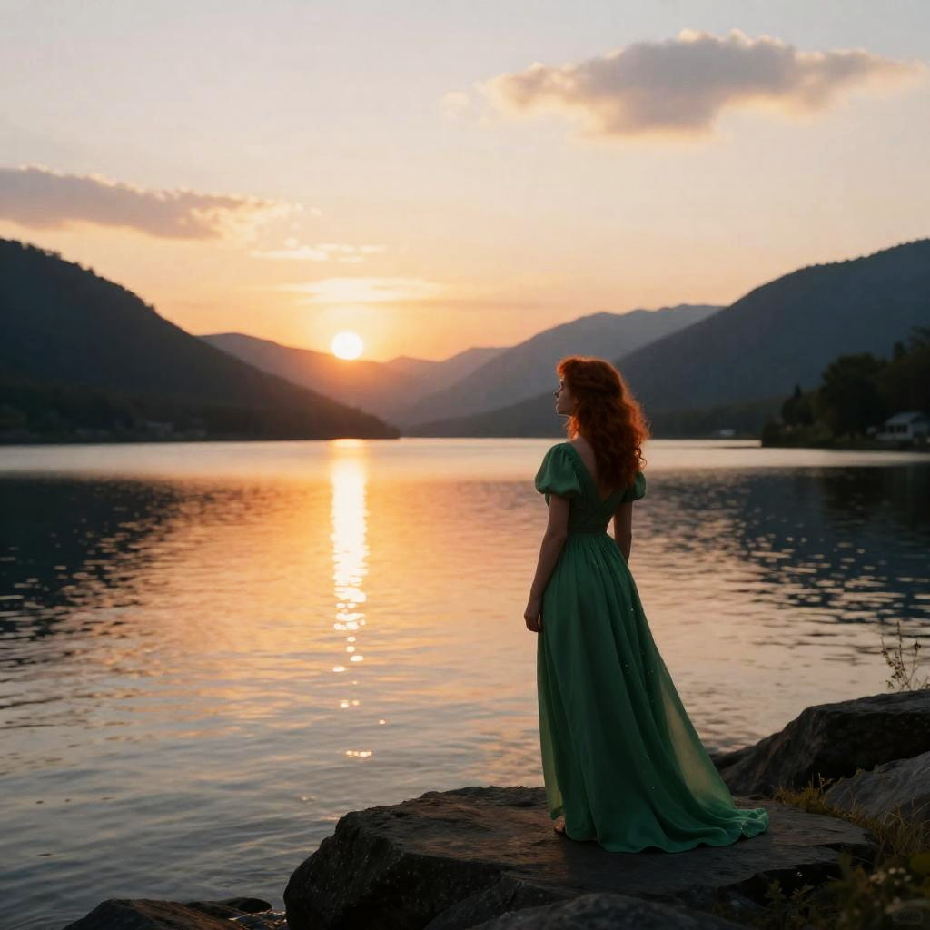 Photograph of a red-haired woman in a flowing, green dress standing on a rocky shoreline at sunset. She faces a calm, reflective lake with silhouetted mountains in the background. The sky is painted with warm orange and pink hues, with the sun just above the horizon. Her wavy hair cascades down her back, and she stands with her arms by her sides, gazing at the sunset. The water sparkles with the sun's reflection, creating a serene and peaceful atmosphere. The scene captures a moment of tranquil beauty and contemplation.