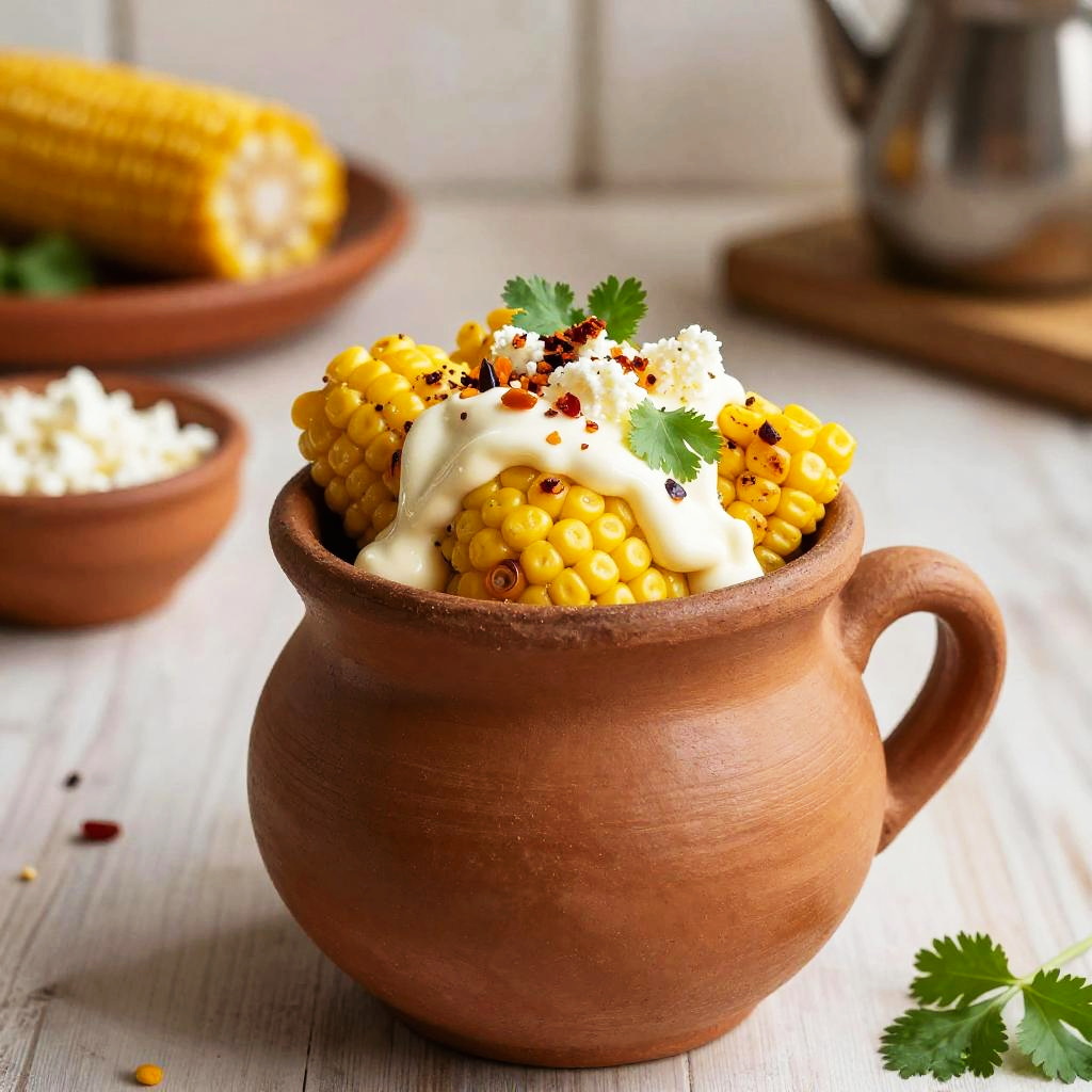 Traditional esquite served in a handcrafted clay cup, overflowing with golden roasted corn, mayonnaise, Cotija cheese, chili flakes, and fresh cilantro, detailed textures, cozy kitchen table setting, soft afternoon light, authentic Mexican culinary style.