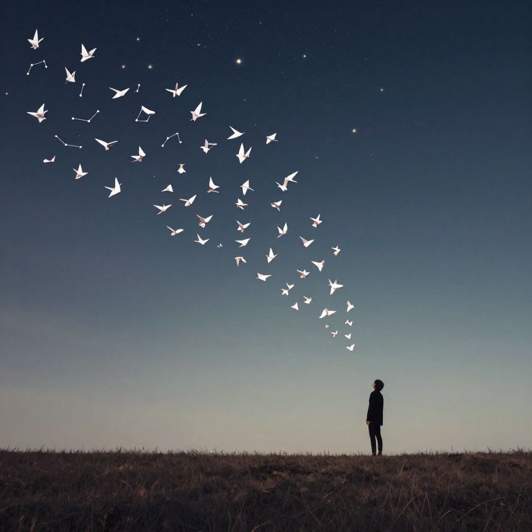 A solitary figure stands at the edge of a dreamlike field, releasing a flock of origami birds into a sky of molten ink, where constellations of forgotten memories shimmer like stars, evoking a profound sense of longing and the ephemeral beauty of letting go.