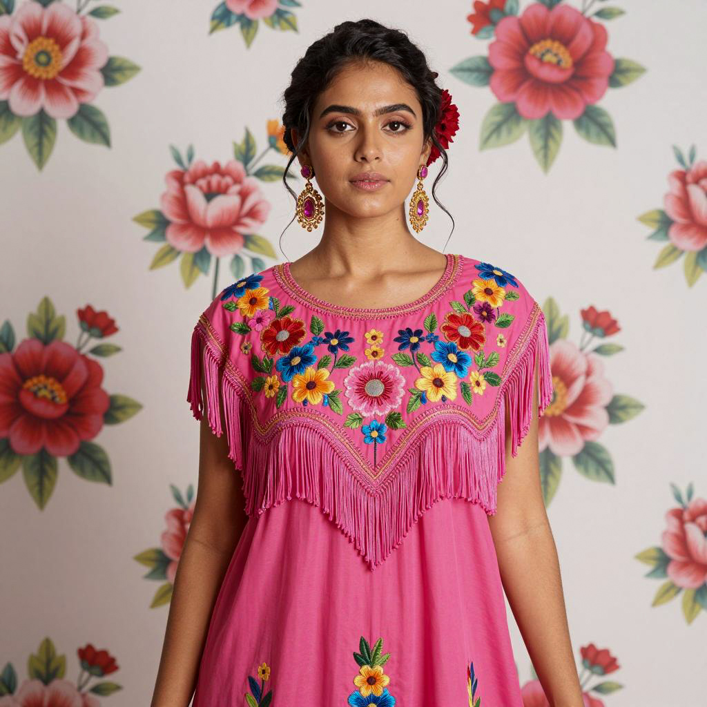 Portrait of a young woman with medium brown skin and dark hair styled in an updo with a red flower. She is wearing a vibrant pink dress adorned with colorful floral embroidery and fringe details. The woman also wears large, ornate gold earrings with pink gemstones. The background features a matching bright floral pattern, enhancing the vivid and cohesive look. The subject faces forward with a neutral expression and relaxed posture.