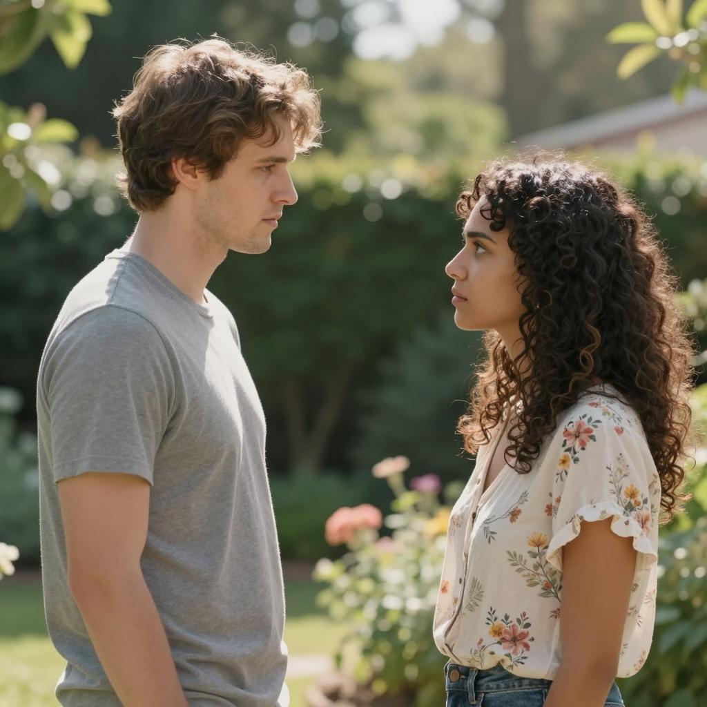 Photograph of two people outdoors. Man with blond hair, blue shirt, black jacket, holding watering can, looking at plants. Woman with dark hair, wearing striped scarf, looking at man. Lush green plant with yellow flowers between them. Sunlight.