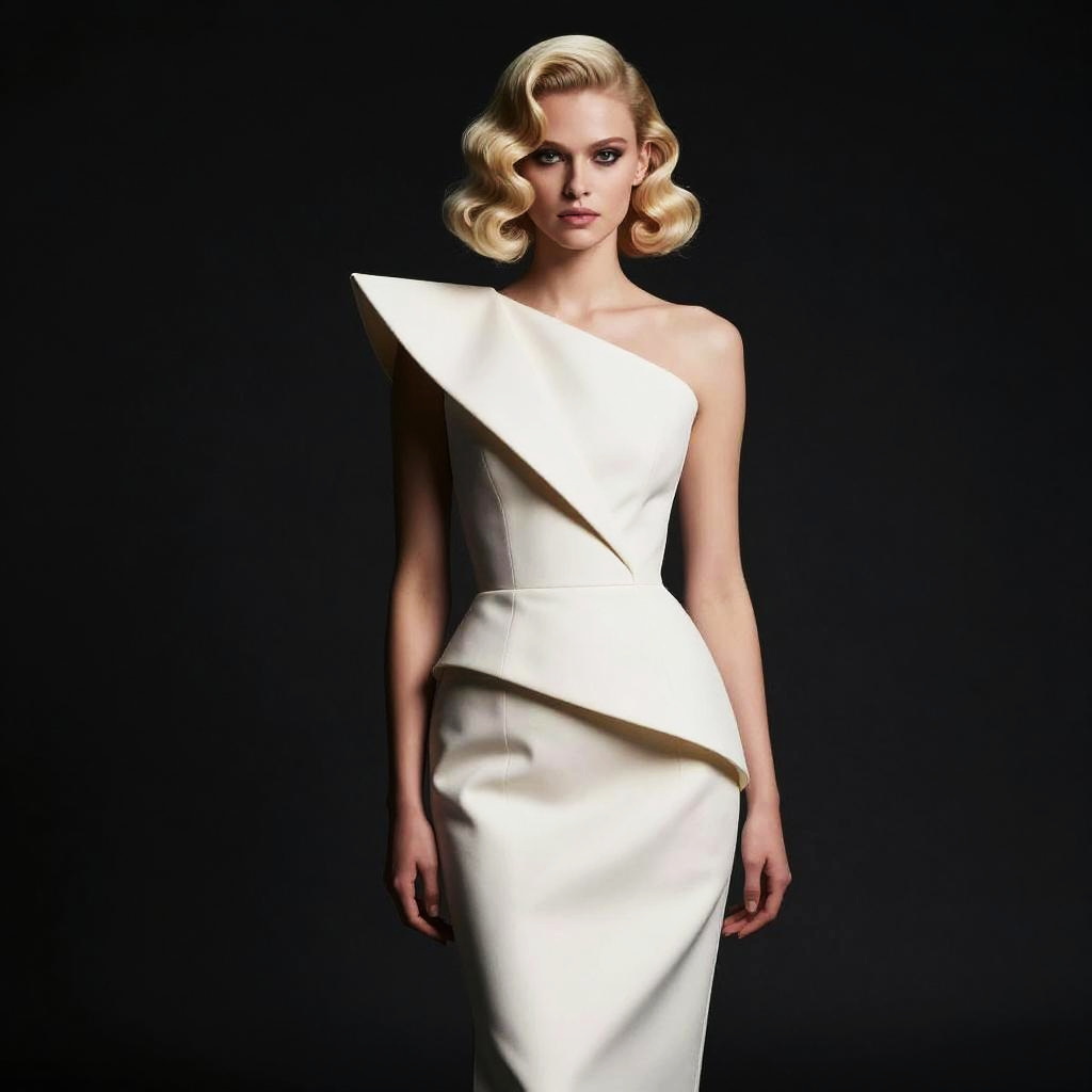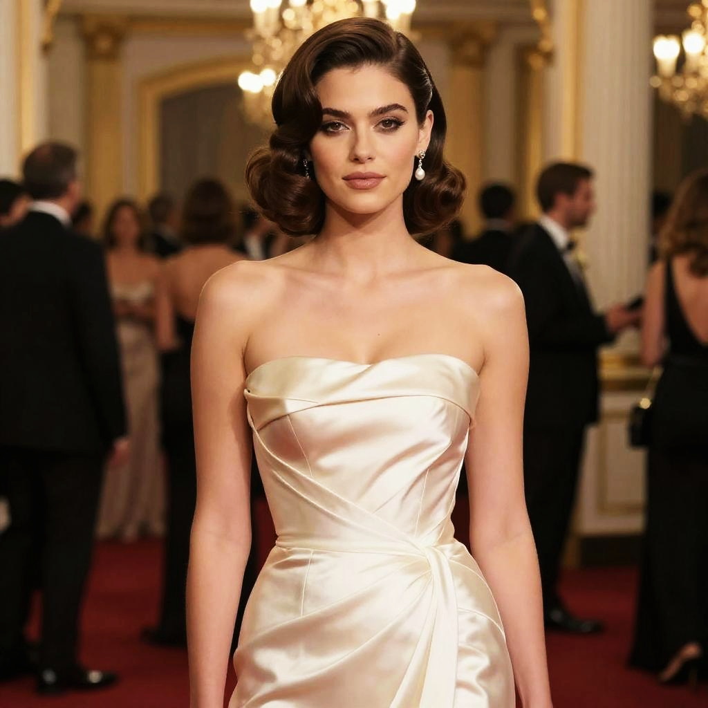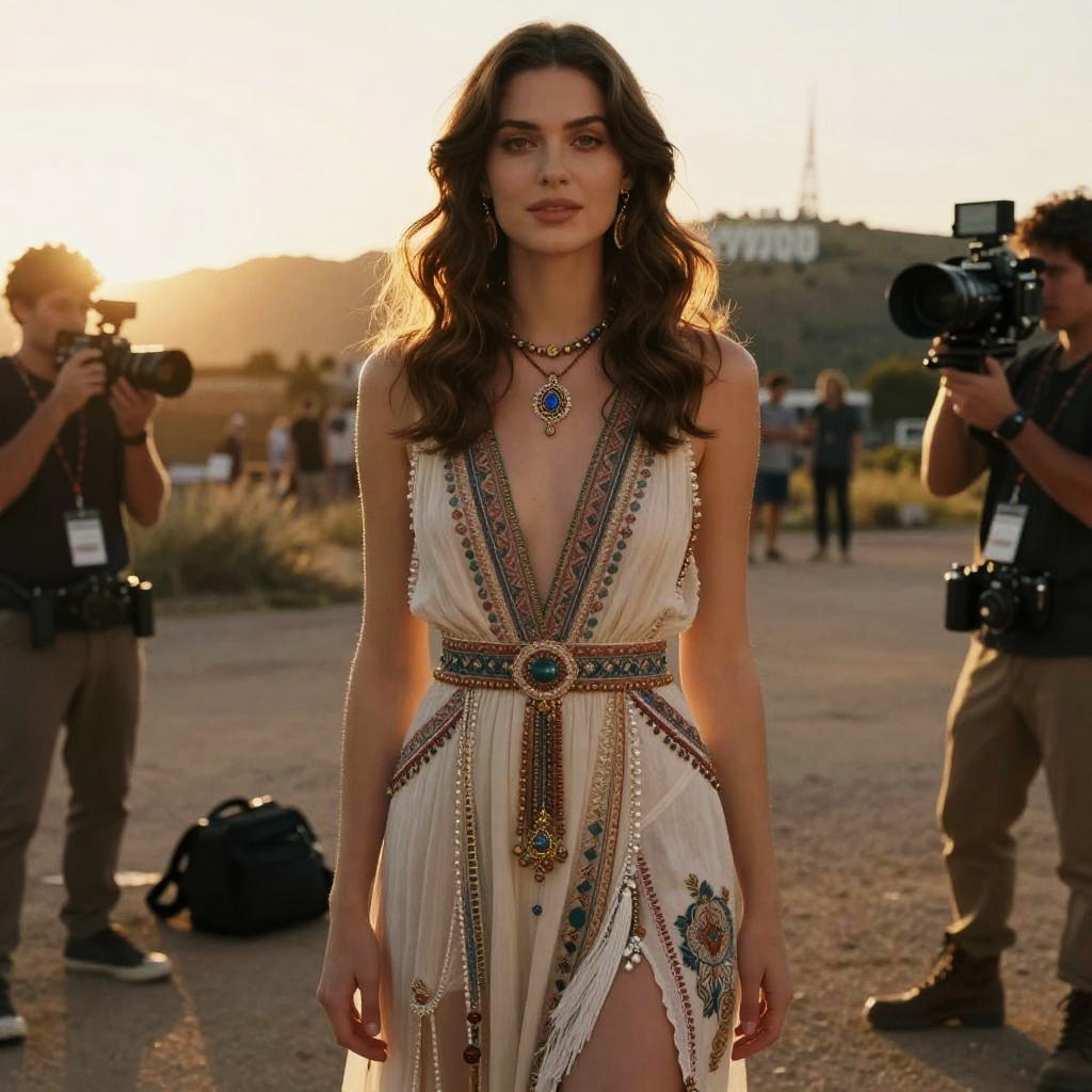 Hollywood Waves hairstyle on fashion blogger, wearing boho chic evening dress, in film set, captured in fashion editorial style with soft sunset glow.