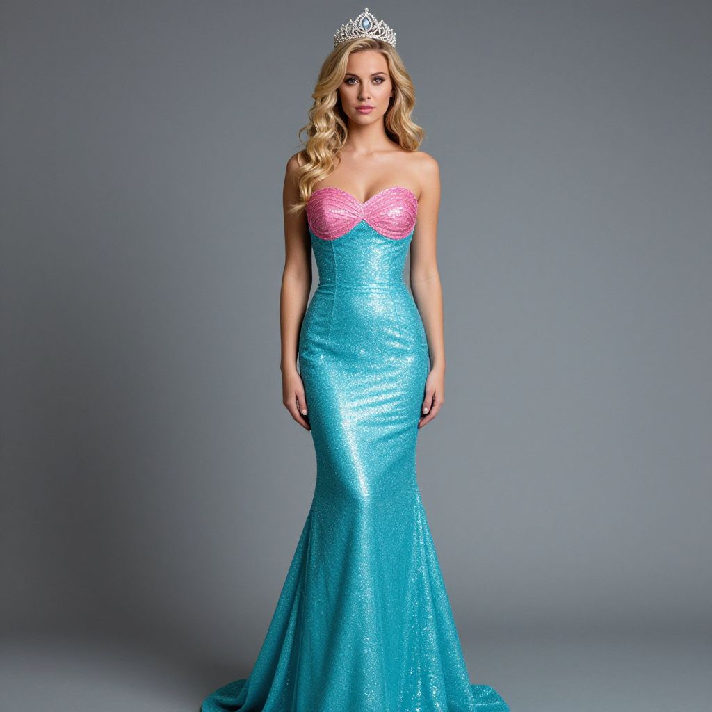 A photograph of a blonde woman with wavy hair, wearing a sparkly, strapless mermaid-style gown that's turquoise with a pink, glittery bust. She has a silver tiara on her head and is standing against a plain gray background. Her expression is neutral, and she's looking directly at the camera. The gown fits snugly, emphasizing her figure. The overall style is fairytale-inspired.