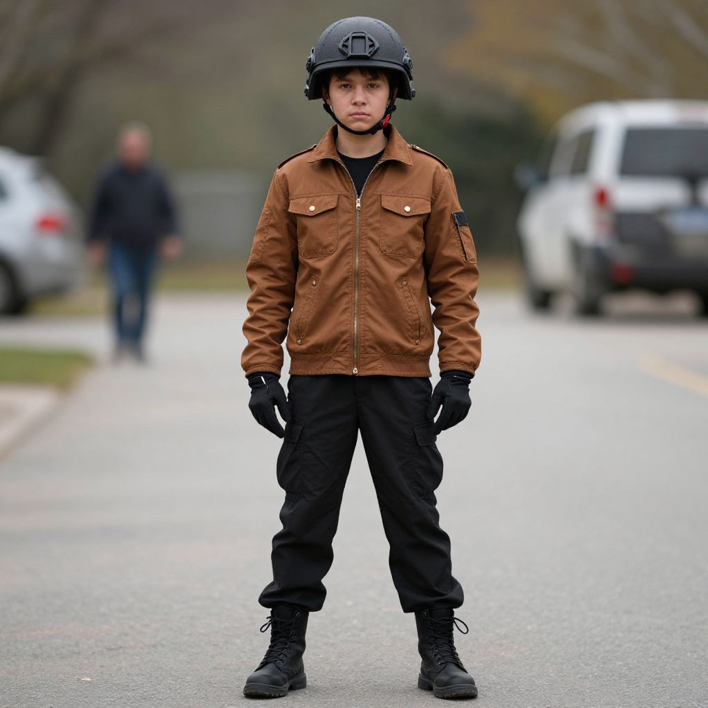 Man in green military uniform with blue pants and brown boots. He is wearing a blue helmet with a blue emblem on the top. He has headphones on his head and is holding a red bag in one hand and a stick in the other.