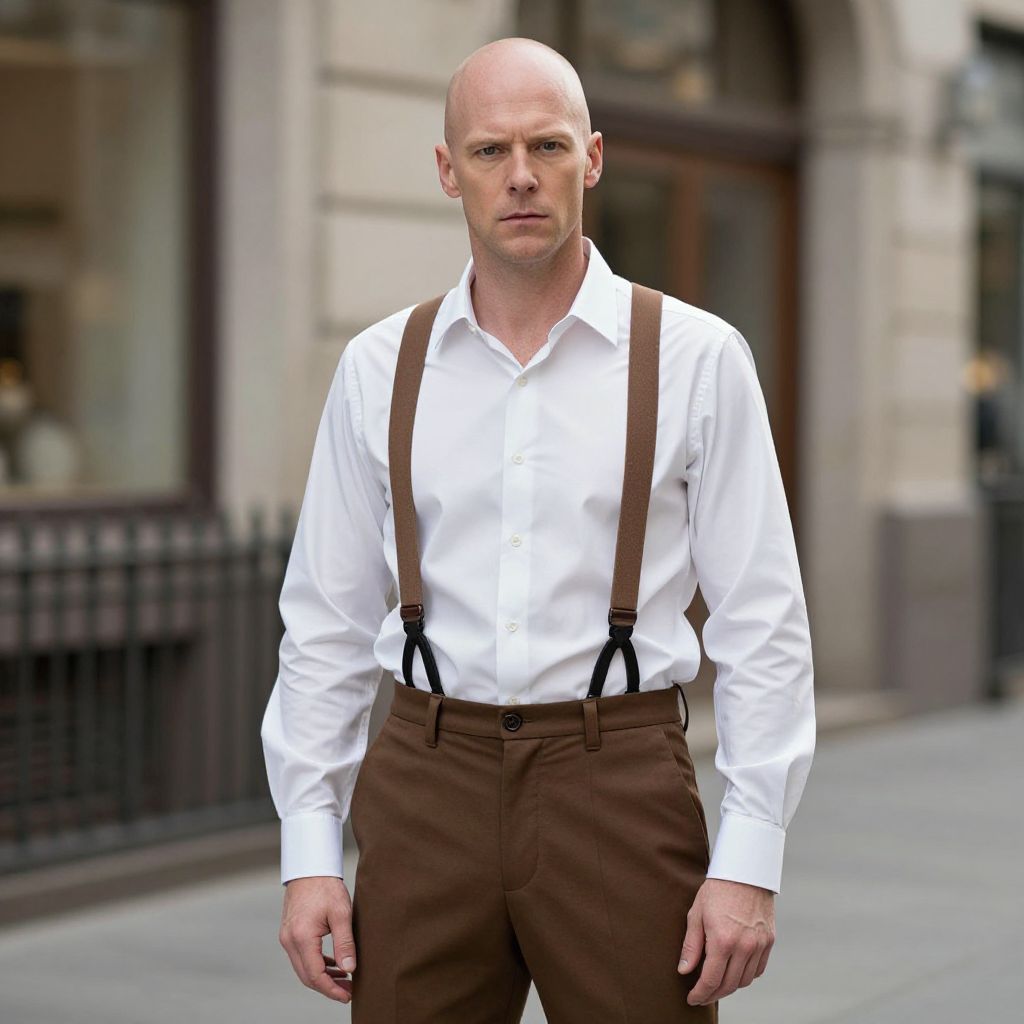 Bald, fair-skinned man with serious expression, wearing white shirt, brown suspenders, and brown pants, standing on urban sidewalk. Photoreal