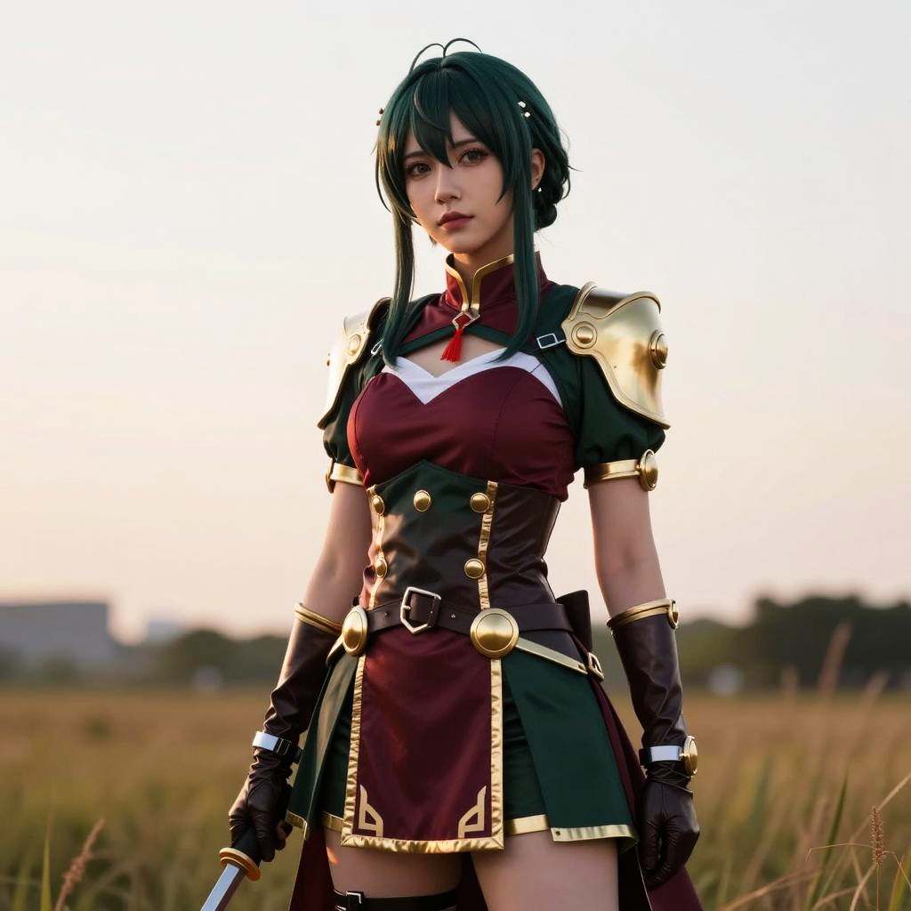 Cosplay Redfield, woman in a green and red costume holding a gun