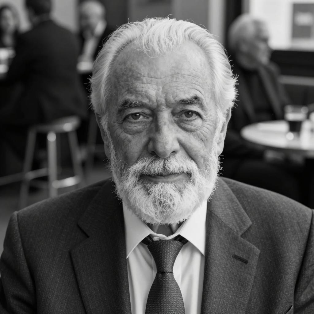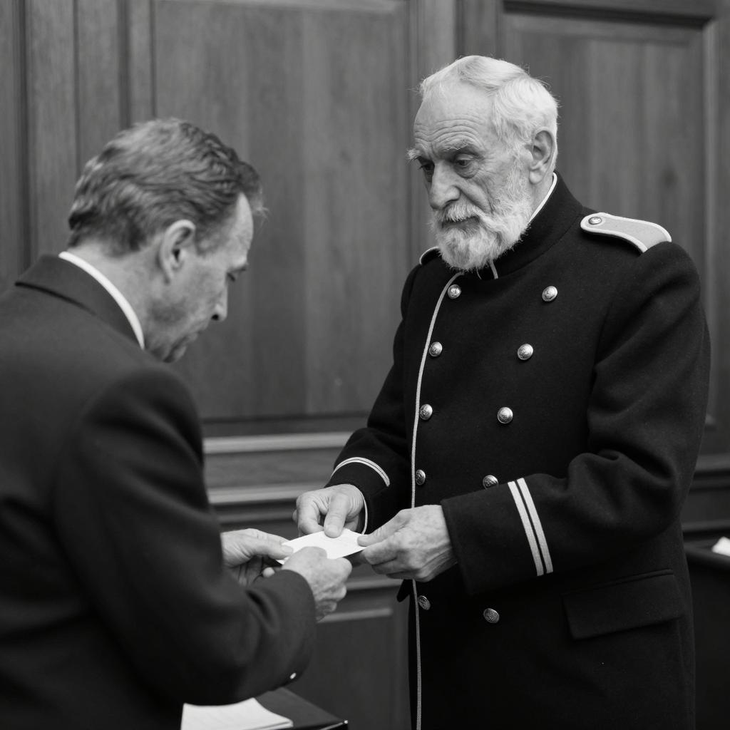 Old man with white beard, wearing black double-breasted coat and vest, standing, looking up, intense expression, book on table, blurred foreground object on left. Sepia-toned photograph.