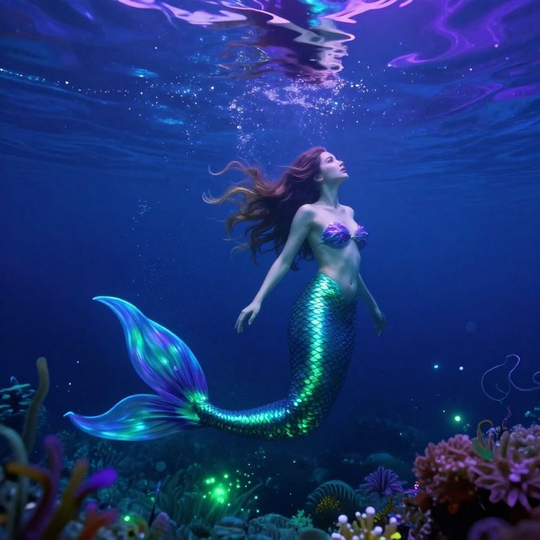 Envision a surreal seascape where reality fuses with imaginative visions, featuring an underwater world adorned with luminescent coral reefs and undulating seaweed forming mesmerizing patterns. Amidst this captivating aquatic environment, place a majestic mermaid adorned in scales that emit iridescent colors shifting like a prismatic spectrum. Her movements are both delicate and alluring as she gracefully traverses the mystical depths, embodying an ethereal charm. The scene evokes wonder and intrigue as light filters through the water, casting enchanting shadows on her refined features and surrounding marine life, subtly integrating the melting clock motif into either a nearby coral sculpture or intricately woven within the patterns of her tail.