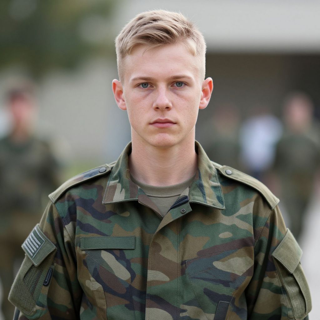 Camouflage fancy dress, solo, realistic, blonde hair, blurry background, male focus, 1boy, looking at viewer, military, blurry, military uniform, uniform, outdoors, short hair, blue eyes, closed mouth