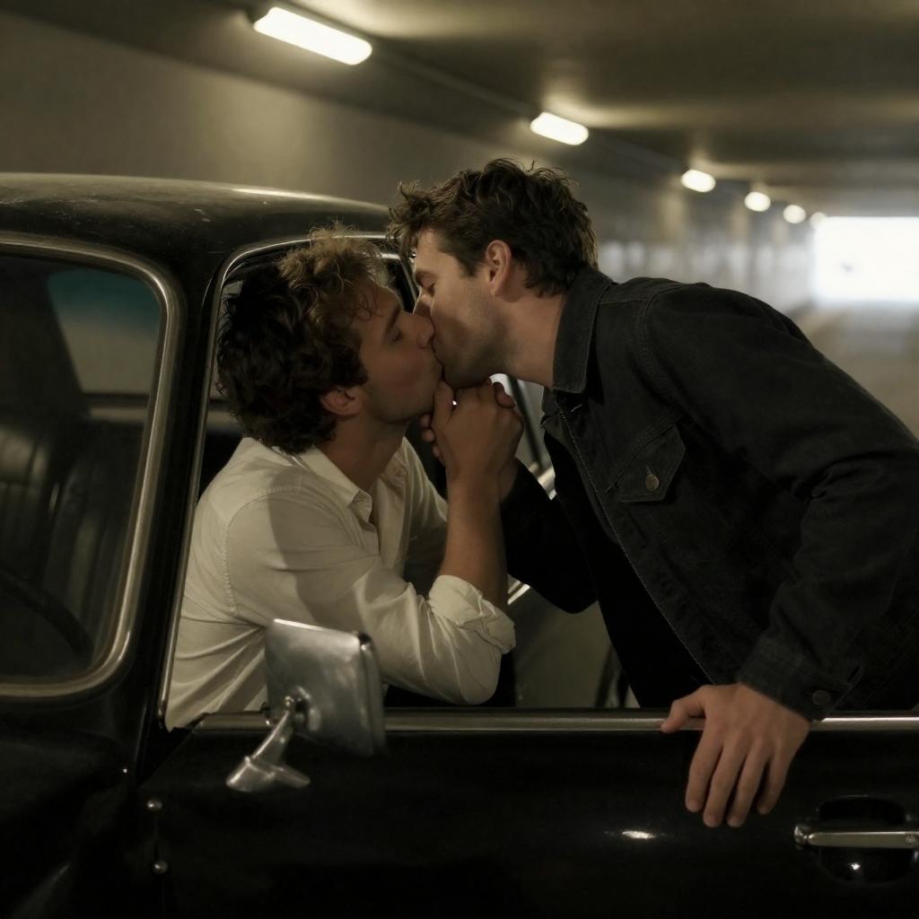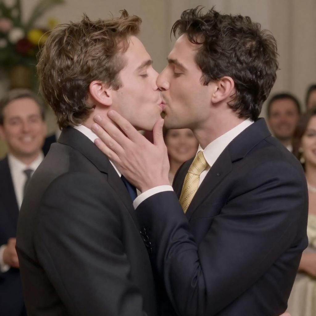Photograph of two men kissing passionately in a crowded room. Both wear dark suits; one has light brown hair, the other has dark hair. Man on left has hands on other's neck, both eyes closed. Background includes smiling, blurred people and festive decorations. Man on right has yellow tie.