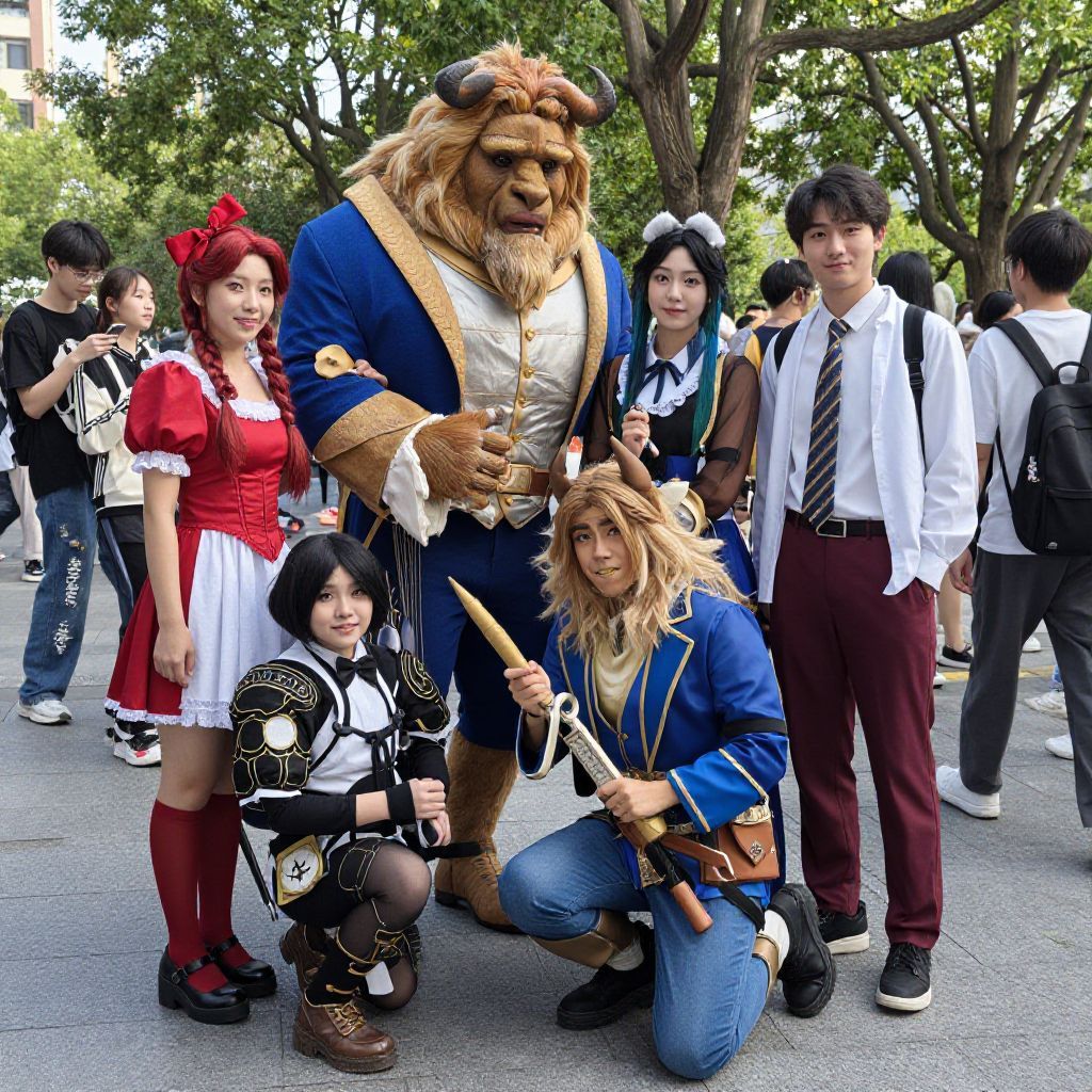 Refined group of cosplayers dressed as Beauty and the beast characters, having fun, street setting, people passing by,