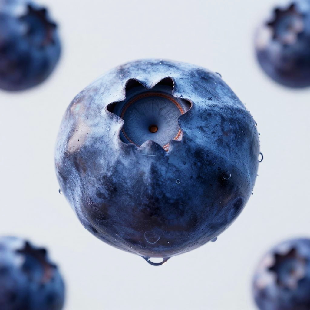 Blueberry inflation depicted in AI-generated art, close-up highly detailed image of a blueberry inflating gently like a balloon, with translucent skin revealing subtle internal structures, bright ambient light source, creative blend of science fiction and organic life forms.