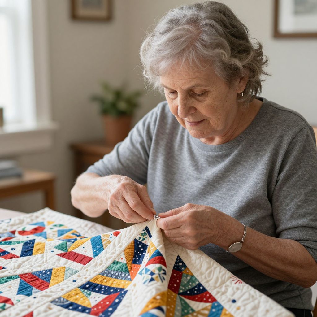 A Senior Woman Expertly Stitches the Binding Onto Her Quilt