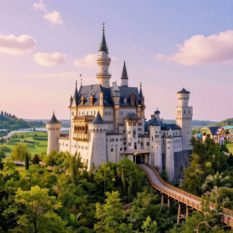 Photograph of a grand, medieval-style castle with multiple towers, surrounded by lush green trees and connected by a wooden bridge, under a bright blue sky