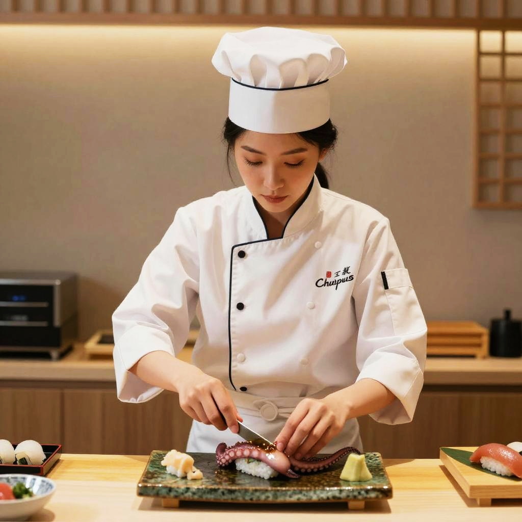Photograph of an Asian female sushi chef in a white uniform and hat, slicing sushi on a wooden board in a modern kitchen.