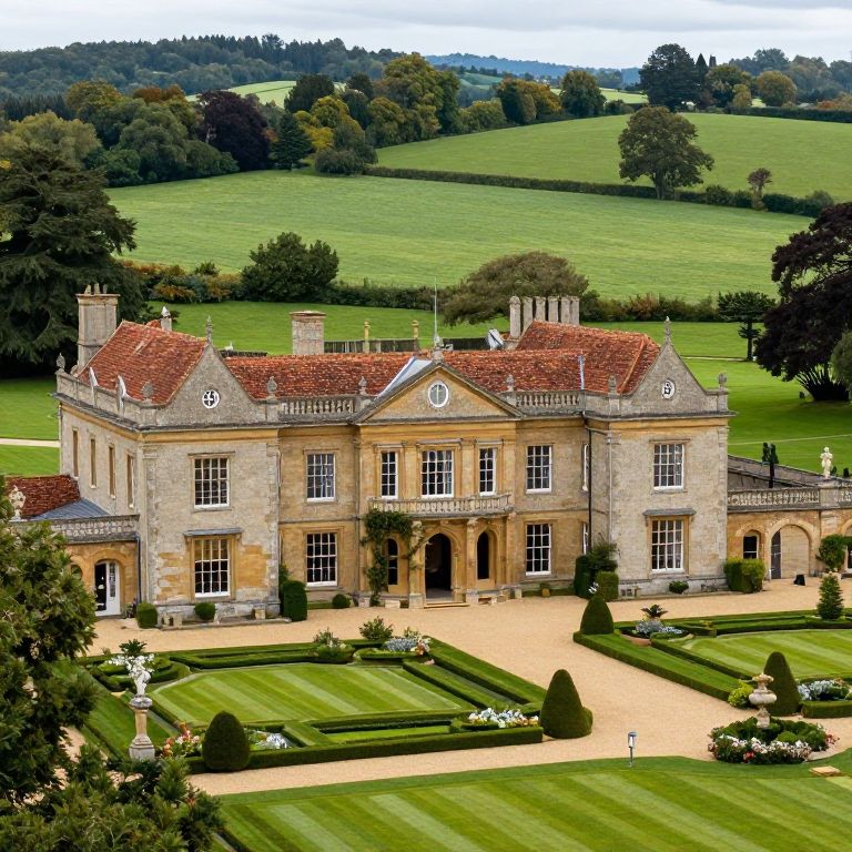 Luxurious country estate in Herefordshire showcases a grand stone mansion with terracotta roofs, surrounded by meticulously manicured gardens, ornate landscaping, and expansive green fields stretching into the horizon.
