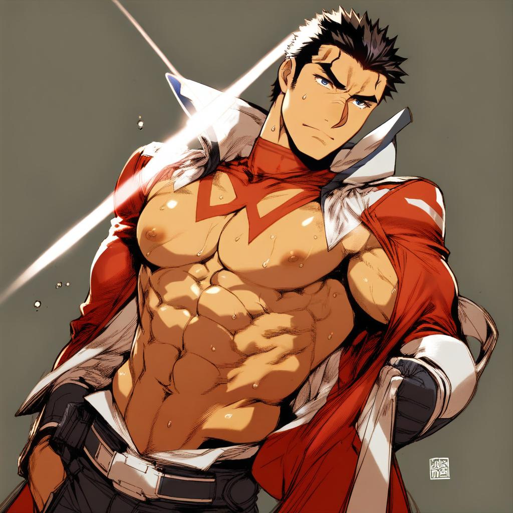 Illustration of a dark-skinned, muscular anime male character with short black hair and thick eyebrows. The character is shown removing a red and white jacket, revealing large pectoral muscles, defined abs, and sweat droplets on his body. The art style is inspired by bara and features strong masculine traits and detailed anatomy.