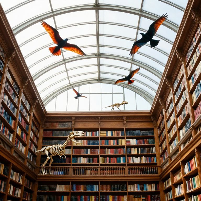 Birds soar gracefully through the arched glass ceiling of a grand library, their vibrant plumage contrasting against the towering wooden bookshelves that line the walls, while a skeletal dinosaur skeleton perches atop a distant shelf, adding an air of prehistoric intrigue to the serene, sunlit space.